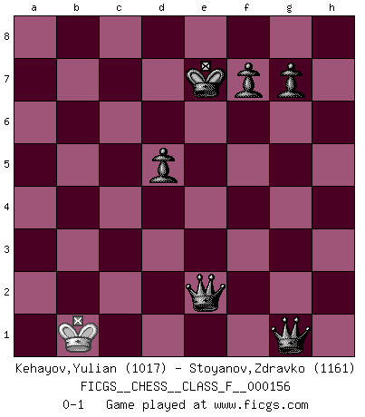 Last move : 0-1 2015 March 27 21:27:45 [Event "FICGS__CHESS__CLASS_F__000156"] [Site "FICGS"] [Date "2015.01.31"] [Round "1"] [White "Kehayov,Yulian"] [Black "Stoyanov,Zdravko"] [Result "0-1"] [WhiteElo "1017"] [BlackElo "1161"] 1.e3 c5 2.d4 a6 3.Nf3 e6 4.c4 Nf6 5.Be2 Nc6 6.Nc3 h6 7.O-O Be7 8.e4 O-O 9.d5 Na5 10.b3 b6 11.h3 exd5 12.exd5 d6 13.Nh2 Re8 14.Re1 Bf5 15.Bg4 Bxg4 16.Nxg4 Nb7 17.Nxf6+ Bxf6 18.Rxe8+ Qxe8 19.Bb2 Bd4 20.Rb1 Qe7 21.Qe1 Re8 22.Kf1 Qd8 23.Qd2 Qf6 24.Ne4 Rxe4 25.Bxd4 Rxd4 26.Qe2 Kf8 27.Rd1 b5 28.cxb5 axb5 29.Rxd4 Qxd4 30.Kg1 Qxd5 31.Qxb5 Ke7 32.a4 Qe4 33.b4 Qe1+ 34.Kh2 Qxb4 35.Qxb4 cxb4 36.g4 b3 37.f4 b2 38.h4 b1Q 39.a5 Nxa5 40.g5 Qc2+ 41.Kh3 Qf5+ 42.Kg3 h5 43.Kf3 Qg4+ 44.Ke3 Nc4+ 45.Kd3 Qxf4 46.Kc3 d5 47.Kb4 Qxh4 48.Kc3 Qxg5 49.Kd4 h4 50.Kc5 h3 51.Kb4 h2 52.Kc5 h1Q 53.Kb4 Na3 54.Kxa3 Qe4 55.Kb3 Qg3+ 56.Kb2 Qe2+ 57.Kb1 Qg1+ 0-1 Van't Kruijs Opening Kingside Castling by player White (move 7) Kingside Castling by player Black (move 8) Promotion Queen by player Black (move 38) 10 pieces endgame at move 45 : White KPP , Black KQNPPPP WHITE : King + 2 Pawns BLACK : King + 1 Queen 1 Knight 4 Pawns 9 pieces endgame at move 47 : White KP , Black KQNPPPP WHITE : King + 1 Pawn BLACK : King + 1 Queen 1 Knight 4 Pawns 8 pieces endgame at move 48 : White K , Black KQNPPPP WHITE : King + BLACK : King + 1 Queen 1 Knight 4 Pawns Promotion Queen by player Black (move 52) 7 pieces endgame at move 54 : White K , Black KQQPPP WHITE : King + BLACK : King + 2 Queens 3 Pawns Player Black won this chess game. Follow this game move after move (download)Spassky will not be psyched out by Fischer. (Mike Goodall) Wenn ich Weiß habe gewinne ich weil ich Weiß habe, wenn ich Schwarz habe gewinne ich weil ich Bogoljubov bin. (Efim Bogoljubov) El Ajedrez es imaginación. (David Bronstein) Les échecs, c'est la lutte contre l'erreur. (Johannes Zukertort) Chess is everything: art, science and sport. (Anatoly Karpov)