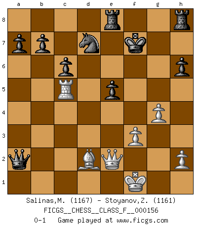 Last move : 0-1 2015 June 12 0:38:56 [Event "FICGS__CHESS__CLASS_F__000156"] [Site "FICGS"] [Date "2015.01.31"] [Round "1"] [White "Salinas,Marcelo"] [Black "Stoyanov,Zdravko"] [Result "0-1"] [WhiteElo "1167"] [BlackElo "1161"] 1.d4 d5 2.Nc3 e6 3.a3 h6 4.e3 Nf6 5.Qf3 Be7 6.Qg3 Nh5 7.Qf3 Nf6 8.Bb5+ c6 9.Bd3 Bd6 10.e4 dxe4 11.Nxe4 Nxe4 12.Bxe4 Nd7 13.Qg4 g6 14.Bxg6 Nf6 15.Bxf7+ Kxf7 16.Qe2 Qg8 17.g3 Qg4 18.f3 Qxd4 19.Be3 Qxb2 20.Rd1 Bxa3 21.Bd2 Qxc2 22.Nh3 e5 23.O-O Bxh3 24.g4 Bxf1 25.Kxf1 Rae8 26.Ra1 Bc5 27.Rc1 Qa2 28.Rxc5 Nd7 0-1 This chess game has been lost on time (started : 2015.01.31 23:3:44) Queen's pawn : Chigorin variation Kingside Castling by player White (move 23) Player Black won this chess game. Follow this game move after move (download)Why must I lose to this idiot ? (Aron Nimzovich) Es gibt zwei Arten von Opfern: Korrekte und meine. (Mikhail Nekhemyevich Tal) Los Peones son el alma de una partida de Ajedrez. (Francois Andre Danican Philidor) Il n'y a plus de joueurs du niveau de Jacob Murray dont la seule quête est le beau jeu, le plaisir de voir les pièces construire quelque chose. Sur 10 idées à la minute, 9 seront sans intérêt, la dernière s'avèrera géniale. (Christian Bauer) Fortune favours the audacious. (Desiderius Erasmus)