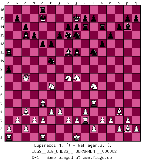 Last move : 0-1 2007 August 1 4:42:43 [Event "FICGS__BIG_CHESS__TOURNAMENT__000002"] [Site "FICGS"] [Date "2007.02.28"] [Round "1"] [White "Lupinacci,Nicola"] [Black "Gaffagan,Steven"] [Result "0-1"] [WhiteElo ""] [BlackElo ""] 1.k1-l3 e15-e13 2.p2-p3 d15-d13 3.b1-c3 n15-n13 4.o1-p2 c15-c14 5.b2-b3 m15-m13 6.c1-b2 o15-o14 7.m2-m3 p16-n15 8.l1-o4 f16-c13 9.n2-n3 g16-f14 10.e2-e3 c16-h11 11.f1-c4 b16-d15 12.j2-k4 l16-o13 13.d2-d3 k16-l14 14.g1-f3 j15-g14 15.h2-g4 h15-j13 16.p1-o3 m13-m12 17.c3-e4 n15-m13 18.o3-m4 e13-e12 19.f3-h4 d15-e13 20.l3-j4 a15-a13 21.g4-h6 f14-h13 22.k4-j6 o16-j11 23.m4-k5 l14-k12 24.e4-g5 f15-f13 25.h4-g6 m13-l11 26.j4-k6 e13-g12 27.g6-h8 g14-h12 28.k6-j8 h16-j15 29.g5-f7 g15-g13 30.k5-l7 f13-f12 31.f2-f4 k12-j10 32.h8-j10 h12-j10 33.f7-h8 j10-h8 34.j6-h8 m16-m14 35.m1-k1 m14-k14 36.k2-k4 q16-m16 37.h6-f7 a13-a12 38.g2-g4 a12-a11 39.h1-b7 a11-a10 40.b7-c8 j15-e15 41.k1-k3 a10-a9 42.k3-l3 j16-j15 43.q1-k1 a16-a11 44.l3-l5 o13-p14 45.b2-e5 g12-f10 46.k1-k3 m16-m14 0-1 Follow this game move after move (download)Those who say they understand Chess, understand nothing. (Robert Hubner) Herr Iljumschinow ist ein etwas merkwürdiger Geschäftsmann: Er arbeitet zusammen mit Leuten wie Muammar al-Gaddafi; früher ist das Saddam Hussein gewesen. (Joel Lautier) El Ajedrez por encima de todo... ¡es una pelea!. (Emanuel Lasker) On est toujours la mazette de quelqu'un d'autre. (Anonyme) Remember : Your focus determines your reality. (Qui-Gon Jinn in Star Wars ep.1)