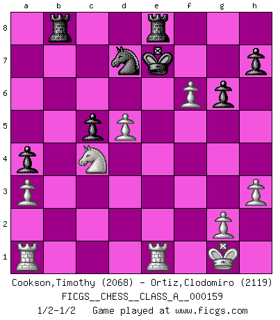 Last move : 1/2-1/2 2015 April 16 11:10:5 [Event "FICGS__CHESS__CLASS_A__000159"] [Site "FICGS"] [Date "2015.02.01"] [Round "1"] [White "Cookson,Timothy"] [Black "Ortiz,Clodomiro"] [Result "1/2-1/2"] [WhiteElo "2068"] [BlackElo "2119"] 1.e4 e5 2.Nf3 Nc6 3.Bb5 a6 4.Ba4 Nf6 5.O-O Be7 6.Re1 b5 7.Bb3 O-O 8.c3 d6 9.h3 Nb8 10.d4 Nbd7 11.Nbd2 c5 12.Bc2 exd4 13.cxd4 Re8 14.d5 a5 15.b3 Nb6 16.Nf1 Ba6 17.Ne3 g6 18.Bb2 Bf8 19.a3 Bg7 20.Qb1 Rc8 21.Bc3 a4 22.bxa4 Nxa4 23.Bxa4 bxa4 24.Nd2 Nd7 25.Bxg7 Kxg7 26.Qb2+ Qf6 27.Qxf6+ Kxf6 28.Nec4 Bxc4 29.Nxc4 Ke7 30.f4 Rb8 31.e5 dxe5 32.fxe5 f6 33.exf6+ 1/2-1/2 Ruy Lopez : Closed, 7...O-O Kingside Castling by player White (move 5) Kingside Castling by player Black (move 7) This chess game ended in a draw. Follow this game move after move (download)A strong memory, concentration, imagination, and a strong will is required to become a great Chess player. (Bobby Fischer) Frage: Was machen Sie mit den Preisen? Anwort: Ich habe Angst, dass meine Freundin davon neue Kleider kauft. (Loek van Wely) Bobby es el jugador de Ajedrez mas fino que este país jamás haya producido. Su memoria para las movidas, su brillantez en soñar combinaciones y su feróz determinación por la victoria son algo extraño. (John Collins) Les Echecs mettent en conflit, non pas deux intelligences, mais deux volontés. (Lasker) Don't be irreplaceable, if you can't be replaced, you can't be promoted. (Dan Rotaru)
