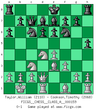 Last move : 0-1 2015 April 29 8:52:58 [Event "FICGS__CHESS__CLASS_A__000159"] [Site "FICGS"] [Date "2015.02.01"] [Round "1"] [White "Taylor,William"] [Black "Cookson,Timothy"] [Result "0-1"] [WhiteElo "2110"] [BlackElo "2068"] 1.e4 c5 2.Nf3 d6 3.d4 cxd4 4.Nxd4 Nf6 5.Nc3 Nc6 6.Bg5 e6 7.Qd2 a6 8.O-O-O Bd7 9.f3 Be7 10.Be3 h5 11.Kb1 Qc7 0-1 Sicilian : Richter-Rauzer, Rauzer attack, 7...a6 Queenside Castling by player White (move 8) Player Black won this chess game. Follow this game move after move (download)You can only get good at Chess if you love the game. (Bobby Fischer) Wenn ich Weiß habe gewinne ich weil ich Weiß habe, wenn ich Schwarz habe gewinne ich weil ich Bogoljubov bin. (Efim Bogoljubov) Yo no le temo a Spassky. Todos saben que yo soy el mejor. Uno no necesita un torneo para probarlo. (Bobby Fischer) Même si vous avez un bon coup à faire, regardez toujours s'il n'y en a pas un qui lui soit préférable. (Pedro Damiano) The production of too many useful things results in too many useless people. (Karl Marx)