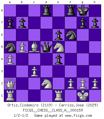 Last move : 1/2-1/2 2015 March 18 17:0:25 [Event "FICGS__CHESS__CLASS_A__000159"] [Site "FICGS"] [Date "2015.02.01"] [Round "1"] [White "Ortiz,Clodomiro"] [Black "Carrizo,Jose"] [Result "1/2-1/2"] [WhiteElo "2119"] [BlackElo "2029"] 1.e4 e5 2.Bc4 Nf6 3.d3 Nc6 4.Nf3 Be7 5.O-O O-O 6.c3 d6 7.a4 Be6 8.Bxe6 fxe6 9.b4 Qe8 10.Qb3 d5 11.Be3 Qd7 12.Re1 Rad8 13.b5 Na5 14.Qa2 dxe4 15.Nxe5 Qd5 16.d4 c5 17.Nd2 cxd4 18.Bxd4 Bc5 19.Bxc5 1/2-1/2 Bishop's Opening : Berlin defense Kingside Castling by player White (move 5) Kingside Castling by player Black (move 5) This chess game ended in a draw. Follow this game move after move (download)When you see a good move, look for a better one. (Emanuel Lasker) Versuche, dich von der Sklaverei der Eröffnungsvarianten zu befreien. Stattdessen soll man gewisse Typenpositionen erlernen, die man eingehend analysiert. (Aaron Nimzowitsch) Sin errores no puede haber brillantez. (Emanuel Lasker) Les réformistes prétendent que les progrès de la théorie conduiront à la disparition des échecs, et qu'il faut, pour leur rendre vie, en remanier les règles. En réalité, qu'exprime cette affirmation? Le mépris de l'intuition, de l'imagination et de tous les autres éléments qui font des échecs un art. (Alexander Alekhine) Real knowledge is to know the extent of one's ignorance. (Confucius)
