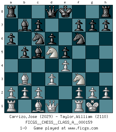 Last move : 1-0 2015 April 15 18:44:47 [Event "FICGS__CHESS__CLASS_A__000159"] [Site "FICGS"] [Date "2015.02.01"] [Round "1"] [White "Carrizo,Jose"] [Black "Taylor,William"] [Result "1-0"] [WhiteElo "2029"] [BlackElo "2110"] 1.e4 e5 2.Nf3 Nc6 3.Bb5 a6 4.Ba4 Nf6 5.O-O b5 6.Bb3 Bb7 7.d3 Bc5 8.Nc3 d6 9.Nd5 1-0 This chess game has been lost on time (started : 2015.02.01 1:39:32) Ruy Lopez : Archangelsk (counterthrust) variation Kingside Castling by player White (move 5) Player White won this chess game. Follow this game move after move (download)Human affairs are like a Chess game: only those who do not take it seriously can be called good players. (Hung Tzu Ch'eng) Der zweitbeste Zug ist oft der einzig richtige. (Savielly Grigorievitsch Tartakower) Yo no creo en la psicología. Yo creo en las buenas movidas. (Bobby Fischer) Le profane ne songe pas à la somme de jouissance dont il se prive, qui méconnaît ce jeu aux ressources aussi variées que passionnantes. (Jean-Marie Jeanton-Lamarche) We need strong personalities and only one world champion to attract sponsors. (Anatoly Karpov)