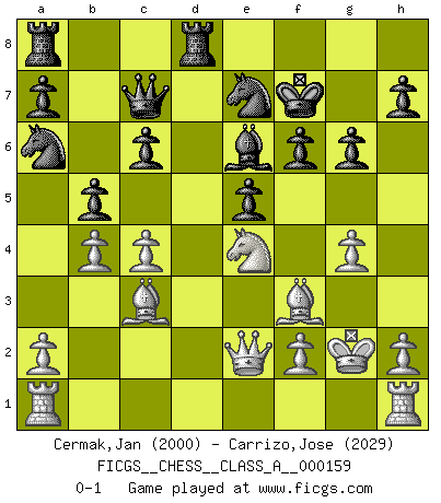 Last move : 0-1 2015 July 20 18:18:19 [Event "FICGS__CHESS__CLASS_A__000159"] [Site "FICGS"] [Date "2015.02.01"] [Round "1"] [White "Cermak,Jan"] [Black "Carrizo,Jose"] [Result "0-1"] [WhiteElo "2000"] [BlackElo "2029"] 1.d4 d5 2.c4 e6 3.Nc3 c6 4.e4 dxe4 5.Nxe4 Bb4+ 6.Bd2 Qxd4 7.Bxb4 Qxe4+ 8.Be2 Na6 9.Ba5 f6 10.Nf3 b6 11.Nd2 Qf5 12.Bh5+ g6 13.Bf3 Qe5+ 14.Kf1 Qc7 15.Bc3 e5 16.Ne4 Kf7 17.b4 Ne7 18.Qe2 Rd8 19.g4 Be6 20.Kg2 b5 0-1 QGD : Semi-Slav, Marshall gambit Player Black won this chess game. Follow this game move after move (download)Every Chess master was once a beginner. (Chernev) Dieses schreckliche Gefühl, dass ich gegen eine Maschine spielte, die niemals Fehler macht, zerschmetterte meinen Widerstand. (Mark Taimanov) El Ajedrez es un juego terrible. Si no dominas el centro, tu oponente tiene una posición mas libre. Si tu tienes el centro, entonces realmente tienes algo de que preocuparte. (Siegbert Tarrasch) Le thème de l'attaque double intervient d'une manière ou d'une autre dans l'immense majorité des combinaisons. (Youri Averbakh) Beta. Software undergoes beta testing shortly before it's released. Beta is latin for still doesn't work. (Anonymous)