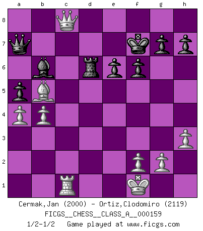 Last move : 1/2-1/2 2015 April 15 20:4:44 [Event "FICGS__CHESS__CLASS_A__000159"] [Site "FICGS"] [Date "2015.02.01"] [Round "1"] [White "Cermak,Jan"] [Black "Ortiz,Clodomiro"] [Result "1/2-1/2"] [WhiteElo "2000"] [BlackElo "2119"] 1.d4 Nf6 2.c4 e6 3.Nf3 c6 4.Nc3 d5 5.e3 Nbd7 6.Qc2 a6 7.b3 Bd6 8.Bb2 O-O 9.Be2 b6 10.O-O Bb7 11.e4 dxe4 12.Nxe4 Nxe4 13.Qxe4 Nf6 14.Qc2 a5 15.c5 Bc7 16.cxb6 Bxb6 17.Ba3 Re8 18.Rfd1 Qc7 19.Rac1 Red8 20.Bb2 Rac8 21.Ne5 c5 22.Qd3 Bd5 23.Nc4 Ba7 24.dxc5 Bxc5 25.Be5 Qe7 26.Qg3 Ne8 27.h3 Qb7 28.Bf1 Ra8 29.a4 Qe7 30.Be2 Bxc4 31.Rxd8 Rxd8 32.Rxc4 Qa7 33.Rc1 Rd2 34.Kf1 Rd5 35.Bb5 f6 36.Bf4 Nd6 37.Bxd6 Rxd6 38.Qc3 Bb6 39.b4 Kf7 40.Qc8 1/2-1/2 Queen's pawn game Kingside Castling by player Black (move 8) Kingside Castling by player White (move 10) This chess game ended in a draw. Follow this game move after move (download)In Chess, as it is played by masters, chance is practically eliminated. (Emanuel Lasker) Er war ein guter Schachspieler, aber ich kann Leute nicht ausstehen, die 'Heil Hitler' rufen (Über Alexander Aljechin). (Miguel Najdorf) Sin errores no puede haber brillantez. (Emanuel Lasker) Vous savez, camarade Pachman, je n'éprouve pas de plaisir à être ministre, je jouerais plutôt aux échecs comme vous, ou alors ferais une révolution au Venezuela. (Che Guevara à Ludek Pachman, 'Checkmate in Prague', 1975) The message for business people contemplating their place in the cyberspace is simple and direct: get linked or get lost. (Vic Sussman and Kenan Pollack)