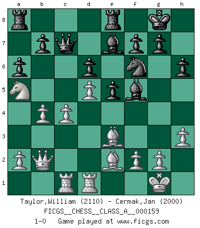 Last move : 1-0 2015 June 18 13:28:40 [Event "FICGS__CHESS__CLASS_A__000159"] [Site "FICGS"] [Date "2015.02.01"] [Round "1"] [White "Taylor,William"] [Black "Cermak,Jan"] [Result "1-0"] [WhiteElo "2110"] [BlackElo "2000"] 1.e4 c5 2.Nf3 d6 3.d4 cxd4 4.Nxd4 Nf6 5.Nc3 a6 6.Be2 e5 7.Nb3 Be7 8.Be3 Be6 9.Nd5 Nxd5 10.exd5 Bf5 11.Qd2 O-O 12.O-O Nd7 13.Na5 Qc7 14.c4 Nf6 15.b4 Ne4 16.Qb2 Rfe8 17.Rfd1 Nf6 18.h3 h6 19.Rac1 1-0 This chess game has been lost on time (started : 2015.02.01 1:39:32) Sicilian : Najdorf, Opovcensky variation Kingside Castling by player Black (move 11) Kingside Castling by player White (move 12) Player White won this chess game. Follow this game move after move (download)When you don't know what to do, wait for your opponent to get an idea - it's sure to be wrong. (Tarrasch) Rauchen ist dem Schachspieler bei seiner Arbeit, also im Wettkampf, untersagt. (Viktor Kortschnoi) Fischer es el jugador mas fuerte del mundo. De hecho, el jugador mas fuerte que jamas haya existido. (Larry Evans) La victoire dans une partie d'Echecs appartient la plupart du temps à celui qui voit un peu plus loin que l'adversaire. (Lasker) For a mechanic, you seem to do an excessive amount of thinking. (C-3PO in Star Wars ep.2)