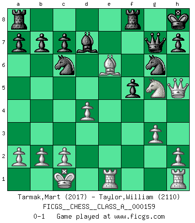 Last move : 0-1 2015 May 17 22:26:24 [Event "FICGS__CHESS__CLASS_A__000159"] [Site "FICGS"] [Date "2015.02.01"] [Round "1"] [White "Tarmak,Mart"] [Black "Taylor,William"] [Result "0-1"] [WhiteElo "2017"] [BlackElo "2110"] 1.e4 e5 2.f4 exf4 3.Nf3 g5 4.Nc3 Bg7 5.g3 d5 6.d4 dxe4 7.Nxe4 g4 8.Bxf4 gxf3 9.Qxf3 Ne7 10.Be5 O-O 11.Bxg7 Kxg7 12.Qf6+ Kg8 13.Qh6 Ng6 14.O-O-O Qe7 15.Re1 f5 16.Bc4+ Kh8 17.Ng5 Qg7 18.Qh5 Bd7 19.Be6 Nc6 0-1 This chess game has been lost on time (started : 2015.02.01 1:39:32) KGA : Quaade gambit Kingside Castling by player Black (move 10) Queenside Castling by player White (move 14) Player Black won this chess game. Follow this game move after move (download)Fischer Chess play was always razor-sharp, rational and brilliant. One of the best ever. (Dave Regis) Es ist im Leben wie im Schachspiel. Wir entwerfen einen Plan, dieser bleibt jedoch bedingt durch das, was im Schachspiel dem Gegner, im Leben dem Schicksal zu tun belieben wird. (Arthur Schopenhauer) Un sacrificio se refuta mucho mejor al aceptarlo. (Wilhelm Steinitz) Le jeu d'échecs fait naître et fortifie en nous plusieurs qualités précieuses dans le cours de l'existence, telles que la prévoyance, la circonspection, la prudence, et la persévérance. (Benjamin Franklin - 1783, la morale des échecs) In every real man a child is hidden that wants to play. (Friedrich Nietzsche)