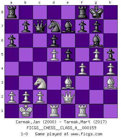Last move : 1-0 2015 May 3 21:9:31 [Event "FICGS__CHESS__CLASS_A__000159"] [Site "FICGS"] [Date "2015.02.01"] [Round "1"] [White "Cermak,Jan"] [Black "Tarmak,Mart"] [Result "1-0"] [WhiteElo "2000"] [BlackElo "2017"] 1.d4 d6 2.Nf3 Bg4 3.e4 Nf6 4.Nc3 e6 5.h3 Bh5 6.g4 Bg6 7.Qe2 c6 8.h4 h5 9.g5 Nfd7 10.Bh3 Be7 11.d5 cxd5 12.exd5 e5 13.Be3 O-O 14.Nd2 Na6 15.O-O-O Qc7 16.Kb1 Nac5 17.Rhf1 Na4 18.Nde4 Nxc3+ 19.Nxc3 a6 20.f4 1-0 This chess game has been lost on time (started : 2015.02.01 1:39:32) Old Indian : Tartakower (Wade) variation Kingside Castling by player Black (move 13) Queenside Castling by player White (move 15) Player White won this chess game. Follow this game move after move (download)Pawns are born free, yet they are everywhere in chains. (Rick Kennedy) Kasparov ist eine Art Monster mit hundert Augen, denen auch nicht das Geringste entgeht. (Tony Miles) Una de estas pequeñas movidas modestas pudieran ser mas molestas a tu oponente que la amenaza mas grande. (Siegbert Tarrasch) L'action d'une oeuvre littéraire se déroule sur un champ de bataille. Les masques et les types du drame moderne correspondent aux pièces du jeu d'échecs. L'intrigue correspond aux coups et aux gambits, c'est à dire aux techniques du jeu telles qu'utilisées et interprétées par les joueurs. Les tactiques et les péripéties [mouvements] correspondent aux coups exécutés par l'adversaire. (Viktor Shklovsky) Some people are so afraid to die that they never begin to live. (Henry Van Dyke)