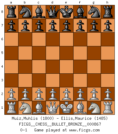 Last move : 0-1 2015 February 1 18:42:24 [Event "FICGS__CHESS__BULLET_BRONZE__000867"] [Site "FICGS"] [Date "2015.02.01"] [Round "1"] [White "Muiz,Muhlis"] [Black "Ellis,Maurice"] [Result "0-1"] [WhiteElo "1800"] [BlackElo "1485"] 0-1 This chess game has been lost on time (started : 2015.02.01 17:39:54) Player Black won this chess game. Follow this game move after move (download)You know, comrade Pachman, I don't enjoy being a Minister, I would rather play Chess like you. (Che Guevara) Es tut gut, die Entwicklungsperiode von, [...] demokratischem Geist durchdringen zu lassen. Wie undemokratisch wäre es doch beispielsweise, den einen Offizier große Spaziertouren vornehmen zu lassen, während die anderen zu Hause säßen und sich entsetzlich langweilten. (Aaron Nimzowitsch) Yo no creo en la psicología. Yo creo en las buenas movidas. (Bobby Fischer) Même si vous avez un bon coup à faire, regardez toujours s'il n'y en a pas un qui lui soit préférable. (Pedro Damiano) CHESS, n. f. [echecs, Fr.] A nice and abstruse game, in which two sets of puppets are moved in opposition to each other. (Dr Samuel Johnson, A Dictionary Of The English Language, 1755)