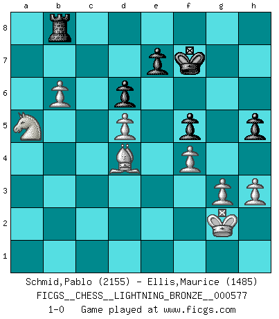 Last move : 1-0 2015 February 1 19:26:5 [Event "FICGS__CHESS__LIGHTNING_BRONZE__000577"] [Site "FICGS"] [Date "2015.02.01"] [Round "1"] [White "Schmid,Pablo"] [Black "Ellis,Maurice"] [Result "1-0"] [WhiteElo "2155"] [BlackElo "1485"] 1.d4 Nf6 2.c4 c5 3.d5 b5 4.cxb5 a6 5.bxa6 g6 6.Nc3 Bxa6 7.g3 d6 8.Bg2 Bg7 9.Nf3 Nbd7 10.Rb1 Qa5 11.O-O O-O 12.Qc2 Ng4 13.Bd2 Nde5 14.Nxe5 Nxe5 15.b3 Rfb8 16.a4 f5 17.Rfe1 Qb6 18.h3 Bf6 19.Rf1 Bg7 20.Kh2 Nf7 21.f4 Nh6 22.Rfe1 Qd8 23.Nd1 Bc8 24.Nb2 Nf7 25.Nc4 Ra7 26.a5 Bd7 27.Nb6 Bb5 28.e4 fxe4 29.Qxe4 Bd4 30.b4 Qe8 31.Bf1 Bxf1 32.Rxf1 Bf6 33.Rfc1 Bd4 34.Rc4 Qf8 35.Rxd4 cxd4 36.Qxd4 Qg7 37.Qd3 Qf6 38.b5 Qf5 39.Qxf5 gxf5 40.Ra1 R8b7 41.a6 Rb8 42.Be3 Nd8 43.Bd4 Kf7 44.Kg2 h5 45.Nc4 R7a8 46.b6 Nb7 47.axb7 Rxa1 48.Bxa1 Rxb7 49.Bd4 Rb8 50.Na5 1-0 Benko gambit accepted Kingside Castling by player White (move 11) Kingside Castling by player Black (move 11) Player White won this chess game. Follow this game move after move (download)Chess is played with the mind and not with the hands ! (Renaud and Kahn) Mein Name ist Rustam Kamsky. Sie haben meinen Sohn belästigt. Bereiten Sie sich aufs Sterben vor. (Rustam Kamsky) A la fecha, Fischer esta simplemente un nivel arriba de todos los mejores jugadores de Ajedrez del mundo. (John Jacobs) Demandez au pauvre Cg1 ce qu'il en pense. Eduard Gufeld à propos de la variante Saemisch de l'Est-Indienne. Life is verb, not a noun. (Charlotte Perkins Gilman)