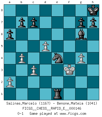 Last move : 0-1 2015 May 23 10:50:47 [Event "FICGS__CHESS__RAPID_E__000146"] [Site "FICGS"] [Date "2015.02.01"] [Round "1"] [White "Salinas,Marcelo"] [Black "Benone,Mateia"] [Result "0-1"] [WhiteElo "1167"] [BlackElo "1041"] 1.e4 e5 2.Nf3 Nf6 3.Nxe5 d6 4.Bc4 dxe5 5.Bd5 Nxd5 6.exd5 Qxd5 7.O-O Nc6 8.Nc3 Qd8 9.d3 Bd6 10.Ne4 O-O 11.Qh5 f6 12.c3 Be6 13.Be3 Bf7 14.Qg4 Kh8 15.Ng3 Bg6 16.Rad1 Qc8 17.Qa4 f5 18.f4 exf4 19.Bxf4 Bxf4 20.Qxf4 Qd7 21.d4 Rae8 22.b4 a6 23.d5 Ne5 24.h3 Qa4 25.Rfe1 Nd3 26.Rxe8 Qxd1+ 27.Qf1 Qxf1+ 28.Kxf1 Rxe8 29.Kg1 Re1+ 30.Kh2 Nf2 31.h4 f4 32.h5 fxg3+ 33.Kxg3 Ne4+ 34.Kf3 Bxh5+ 35.g4 Bg6 0-1 This chess game has been lost on time (started : 2015.02.01 22:24:57) Petrov's defense Kingside Castling by player White (move 7) Kingside Castling by player Black (move 10) Player Black won this chess game. Follow this game move after move (download)Fischer wanted to give the Russians a taste of their own medicine. (Larry Evans) Im Schach gewinnt jeder. Hat man Freunde am Spiel - und das ist die Hauptsache - ist auch der Verlust einer Partie kein Unglück. (David Bronstein) Yo adoro todas la posiciones. Denme una partida posicional difícil, y la jugaré. Pero posiciones totalmente ganadas, no las tolero. (Hein Donner) La guerre est enfant de la passion, la passion est enfant du narcissisme et le narcissisme est l'enfant. (...) Une autre partie ? (Thibault de Vassal) Man with more than one clock never knows what time it is. (Chinese thought)