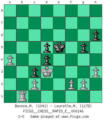 Last move : 1-0 2015 April 14 1:49:22 [Event "FICGS__CHESS__RAPID_E__000146"] [Site "FICGS"] [Date "2015.02.01"] [Round "1"] [White "Benone,Mateia"] [Black "Leurette,Marc-Antoine"] [Result "1-0"] [WhiteElo "1041"] [BlackElo "1178"] 1.e4 e5 2.Nf3 Nc6 3.d4 exd4 4.Bc4 Nf6 5.O-O Bc5 6.e5 Ng4 7.Bxf7+ Kxf7 8.Ng5+ Ke8 9.Qxg4 d6 10.e6 Ne7 11.Nf7 Bxe6 12.Qxe6 Qd7 13.Qxd7+ Kxd7 14.Nxh8 Rxh8 15.Bg5 h6 16.Bxe7 Kxe7 17.Nd2 Rf8 18.Rae1+ Kd7 19.a3 g5 20.b4 Bb6 21.Nc4 c5 22.Nxb6+ axb6 23.bxc5 bxc5 24.h3 b5 25.Rb1 Kc6 26.Rfe1 Rf6 27.Re8 d5 28.Rc8+ Kb6 29.Rb8+ Kc6 30.R8xb5 Re6 31.Rb6+ Kd7 32.Rxe6 Kxe6 33.a4 c4 34.Kf1 c3 35.Ke2 Ke5 36.Kd3 1-0 Scotch gambit : Dubois-Reti defense Kingside Castling by player White (move 5) Player White won this chess game. Follow this game move after move (download)I am the best player in the world and I am here to prove it. (Bobby Fischer) Du weisst es gibt ein Problem mit Computern und Fernschach, wenn jeder eine Rating von 2450 hat. (John Christen Knudsen) Debemos de asegurarnos de que el Ajedrez no se convierta en un lenguaje muerto, muy interesante, pero tan solo para un grupo muy pequeño. (Sytze Faber) La vie et les Echecs sont tous les deux une lutte constante. (Lasker) Looking at the proliferation of personal web pages on the Net, it looks like very soon everyone on Earth will have 15 megabytes of fame. (M.G. Sriram)