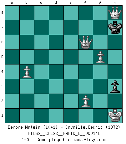 Last move : 1-0 2015 February 24 14:59:55 [Event "FICGS__CHESS__RAPID_E__000146"] [Site "FICGS"] [Date "2015.02.01"] [Round "1"] [White "Benone,Mateia"] [Black "Cavaille,Cedric"] [Result "1-0"] [WhiteElo "1041"] [BlackElo "1072"] 1.e4 c5 2.c3 e6 3.d4 cxd4 4.cxd4 d6 5.Nf3 Nf6 6.Nc3 Be7 7.Bc4 a6 8.O-O b5 9.Bd3 O-O 10.Bf4 Bb7 11.Rc1 h6 12.Qe2 Re8 13.Rfd1 Nc6 14.a3 Rc8 15.e5 dxe5 16.dxe5 Nh5 17.Bh7+ Kxh7 18.Rxd8 Rexd8 19.Qe4+ Kg8 20.Be3 Rd7 21.g4 f5 22.exf6 Nxf6 23.Qxe6+ Kf8 24.g5 Nd8 25.Qh3 Bxf3 26.gxf6 Bxf6 27.Qxd7 Rc6 28.Qf5 Kg8 29.Qxf3 Bxc3 30.Rxc3 Rxc3 31.bxc3 Nf7 32.Bd4 Ng5 33.Qa8+ Kh7 34.Qxa6 Nf3+ 35.Kh1 Nxd4 36.cxd4 b4 37.axb4 g6 38.d5 h5 39.h4 Kh6 40.d6 g5 41.d7 Kg7 42.hxg5 h4 43.Qf6+ Kh7 44.d8Q h3 45.Qd8h8+ 1-0 Sicilian : Alapin's variation (2.c3) Kingside Castling by player White (move 8) Kingside Castling by player Black (move 9) 10 pieces endgame at move 36 : White KQPPPP , Black KPPP WHITE : King + 1 Queen 4 Pawns BLACK : King + 3 Pawns 9 pieces endgame at move 37 : White KQPPPP , Black KPP WHITE : King + 1 Queen 4 Pawns BLACK : King + 2 Pawns 8 pieces endgame at move 42 : White KQPPPP , Black KP WHITE : King + 1 Queen 4 Pawns BLACK : King + 1 Pawn Promotion Queen by player White (move 44) Player White won this chess game. Follow this game move after move (download)A thorough understanding of the typical mating continuations makes the most complicated sacrificial combinations leading up to them not only not difficult, but almost a matter of course. (Siegbert Tarrasch) Unter Putin wird alles Geld aus Russland wie von einem Staubsauger nach Moskau umgeleitet, das ist wie ein schwarzes Loch. (Garry Kasparov) El Ajedrez expande y enriquece tu mente. (Saudin Robovic) Ne tendez aucun piège pour le plaisir ! Ne jouez rien dans l'espoir que l'adversaire réagisse de façon stupide ! Prenez toujours pour acquis que l'adversaire va trouver le meilleur coup ! Ne jouez jamais de coup dans l'espoir que l'adversaire ne voie pas la menace ! Chacun de vos coups doit améliorer la position d'une façon ou d'une autre. We cannot be sure of having something to live for unless we are willing to die for it. (Ernesto Che Guevara)