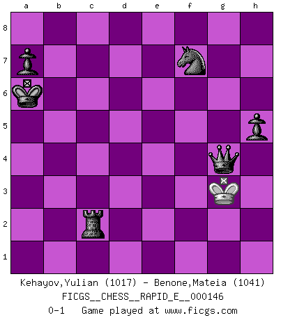Last move : 0-1 2015 May 3 8:18:50 [Event "FICGS__CHESS__RAPID_E__000146"] [Site "FICGS"] [Date "2015.02.01"] [Round "1"] [White "Kehayov,Yulian"] [Black "Benone,Mateia"] [Result "0-1"] [WhiteElo "1017"] [BlackElo "1041"] 1.e4 d6 2.d4 Nf6 3.Nc3 e5 4.dxe5 dxe5 5.Nf3 Nc6 6.Qxd8+ Kxd8 7.a3 Bg4 8.Be2 Bd6 9.h3 Bh5 10.g4 Bg6 11.Bd3 Nd4 12.Nxd4 exd4 13.Ne2 Nxe4 14.Nxd4 Re8 15.O-O Nc5 16.Bxg6 hxg6 17.b4 Ne4 18.c4 c5 19.bxc5 Bxc5 20.Be3 b6 21.Rfd1 Kc8 22.f3 Nc3 23.Re1 Kb7 24.Bf2 Bxd4 25.Bxd4 Ne2+ 26.Kf2 Nxd4 27.Rxe8 Rxe8 28.h4 Re2+ 29.Kf1 Rc2 30.a4 Nxf3 31.h5 gxh5 32.gxh5 Rxc4 33.a5 b5 34.Kf2 Ne5 35.h6 gxh6 36.a6+ Kb6 37.Ke3 h5 38.Rf1 Kxa6 39.Rf5 Ng4+ 40.Kf3 b4 41.Rxf7 Ne5+ 42.Ke3 Nxf7 43.Kf3 b3 44.Ke3 b2 45.Kf3 b1Q 46.Ke3 Qe4+ 47.Kf2 Rc2+ 48.Kg3 Qg4+ 0-1 Pirc defense Kingside Castling by player White (move 15) 10 pieces endgame at move 35 : White KRP , Black KRNPPPP WHITE : King + 1 Rook 1 Pawn BLACK : King + 1 Rook 1 Knight 4 Pawns 9 pieces endgame at move 38 : White KR , Black KRNPPPP WHITE : King + 1 Rook BLACK : King + 1 Rook 1 Knight 4 Pawns 8 pieces endgame at move 41 : White KR , Black KRNPPP WHITE : King + 1 Rook BLACK : King + 1 Rook 1 Knight 3 Pawns 7 pieces endgame at move 42 : White K , Black KRNPPP WHITE : King + BLACK : King + 1 Rook 1 Knight 3 Pawns Promotion Queen by player Black (move 45) Player Black won this chess game. Follow this game move after move (download)Chess is not like life... it has rules ! (Mark Pasternak) Capablanka war das größte Genie der Schachgeschichte! Aber denken sie nicht er habe nichts vom Schach verstanden. Er wusste nur soviel wie er wissen musste um seine Ziele zu erreichen. (Mikhail Moiseyevich Botvinik) El Ajedrez es sobre todo, ¡una pelea!. (Emanuel Lasker) Le système Elo représente seulement une moyenne. Il est simplement un indicateur de votre stabilité. (Anatoli Karpov) The good fighters of old first put themselves beyond the possibility of defeat, and then waited for an opportunity of defeating the enemy. (Sun Tzu)
