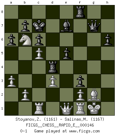 Last move : 0-1 2015 April 12 21:58:49 [Event "FICGS__CHESS__RAPID_E__000146"] [Site "FICGS"] [Date "2015.02.01"] [Round "1"] [White "Stoyanov,Zdravko"] [Black "Salinas,Marcelo"] [Result "0-1"] [WhiteElo "1161"] [BlackElo "1167"] 1.e4 e5 2.Nf3 Nc6 3.h3 d5 4.exd5 Qxd5 5.a3 Nd4 6.Nxd4 Qxd4 7.Nc3 Bf5 8.d3 O-O-O 9.Be3 Qh4 10.Qf3 Nh6 11.Bxh6 Qxh6 12.Qxf5+ Rd7 13.Nd5 Bd6 14.Be2 g6 15.Qf3 f5 16.O-O Rf8 17.c4 c6 18.Nc3 g5 19.Qh5 Qg7 20.Bd1 h6 21.Qe2 a6 22.Na4 Kc7 23.c5 Be7 24.Rc1 Rd4 25.Nb6 g4 26.Qe3 f4 27.Qe1 gxh3 28.Bf3 hxg2 29.Bxg2 f3 0-1 King's pawn game Queenside Castling by player Black (move 8) Kingside Castling by player White (move 16) Player Black won this chess game. Follow this game move after move (download)Chess is a cold bath for the mind. (Sir John Simon) Ein Isolani verdüstert die Stimmung auf dem ganzen Schachbrett. (Savielly Grigorievitsch Tartakower) No hay un Gran Maestro de Ajedrez que sea normal; solo se diferencían ellos por la magnitud de su locura. (Viktor Korchnoi) Il vaut toujours mieux jouer un plan faux de façon logique que de n'avoir pas de plan du tout. (Victor Kortchnoï) Creativity is inventing, experimenting, growing, taking risks, breaking rules, making mistakes, and having fun. (Mary Lou Cook)