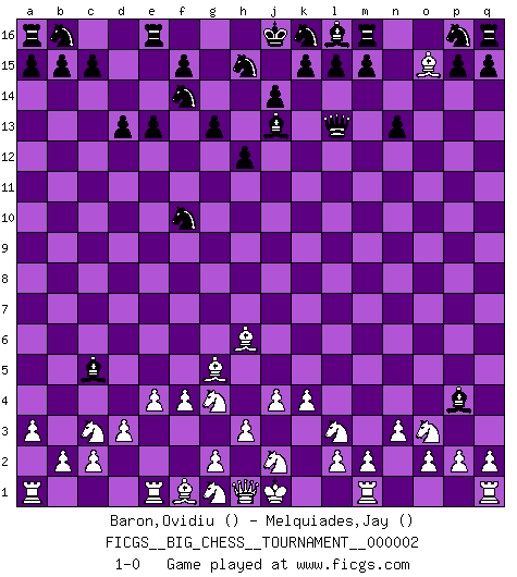 Last move : 1-0 2007 April 27 6:53:57 [Event "FICGS__BIG_CHESS__TOURNAMENT__000002"] [Site "FICGS"] [Date "2007.02.28"] [Round "1"] [White "Baron,Ovidiu"] [Black "Melquiades,Jay"] [Result "1-0"] [WhiteElo ""] [BlackElo ""] 1.p1-o3 d15-d13 2.j3-j4 n15-n13 3.k2-k4 j15-h13 4.b1-c3 o16-b4 5.e2-e4 h16-l13 6.k1-l3 h13-g11 7.a2-a3 b4-c5 8.h2-g4 g15-g13 9.d2-d3 h14-h13 10.l1-d8 f16-j13 11.c1-k8 h13-h12 12.d8-g5 e15-e13 13.f2-f4 g16-f14 14.n2-n3 g11-h9 15.k8-h6 c16-p4 16.o1-g8 h9-f10 17.g8-o15 1-0 This big chess game has been lost on time (started : 2007.02.28 17:14:10) Follow this game move after move (download)Chess is a more highly symbolic game, but the aggressions are therefore even more frankly represented in the play. It probably began as a war game; that is, the representation of a miniature battle between the forces of two kingdoms. (Karl Meninger) Je mehr wir mit Computern analysieren, desto mehr glauben wir an Verteidigung. (Vladimir Kramnik) Personalmente, yo prefiero mirar hacia el futuro en donde un programa de computadora gane el título mundial de Ajedrez. La humanidad necesita una lección de humildad. (Richard Dawkings) Les Echecs sont affaire de jugement sensible. Savoir quand frapper et quand esquiver. (Fischer) . 'gn is not allowed in chess unless n is an integer between 1 and 8 inclusive, where 1 and 8 are to interpreted as the standard numerals standing for integers in the ordered real-closed field R, with the *canonical* ordering. (As opposed to, say, an integer in the domain Z[2+i*sqrt(5)] or an integer in some exotic Grothendieck topos). (Normajean Yates)