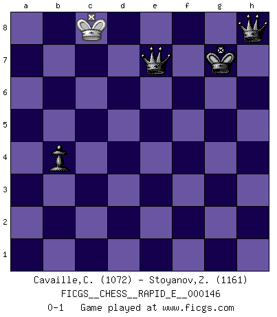 Last move : 0-1 2015 February 14 12:52:11 [Event "FICGS__CHESS__RAPID_E__000146"] [Site "FICGS"] [Date "2015.02.01"] [Round "1"] [White "Cavaille,Cedric"] [Black "Stoyanov,Zdravko"] [Result "0-1"] [WhiteElo "1072"] [BlackElo "1161"] 1.d4 d5 2.c4 dxc4 3.Qa4+ Bd7 4.Qxc4 e6 5.Nf3 Bc6 6.Qd3 h6 7.Nbd2 Bb4 8.a3 Ba5 9.b4 Bb6 10.e3 Nf6 11.Be2 O-O 12.O-O Bd5 13.Nc4 Be4 14.Qd2 Nbd7 15.Qd1 Bd5 16.Nxb6 axb6 17.Bb2 Ne4 18.Rc1 c5 19.b5 Ndf6 20.h3 Qd7 21.a4 Rfe8 22.Bc4 Kh8 23.Bxd5 exd5 24.Ne5 Qf5 25.Nxf7+ Kh7 26.Ne5 g5 27.Bc3 Nxc3 28.Rxc3 Ne4 29.Ra3 Rac8 30.g4 Qf8 31.f3 Nd6 32.Rc3 Nc4 33.Nxc4 dxc4 34.d5 Qd6 35.Kg2 Kg7 36.e4 Kg6 37.Rxc4 h5 38.Qc1 h4 39.Rf2 Qg3+ 40.Kf1 Qxh3+ 41.Ke2 Qg3 42.Qh1 Qe5 43.Qc1 Rcd8 44.Qc3 Qxd5 45.Kf1 Qd1+ 46.Kg2 Rd3 47.Qc2 Red8 48.Qxd1 Rxd1 49.R4c2 R8d4 50.Ra2 c4 51.Rfe2 c3 52.e5 R4d2 53.e6 Rxe2+ 54.Rxe2 Rd2 55.Rxd2 cxd2 56.e7 Kf7 57.Kf2 d1Q 58.Ke3 Kxe7 59.f4 Qxa4 60.fxg5 Qxb5 61.Kf4 Qd5 62.g6 Kf6 63.g5+ Qxg5+ 64.Ke4 h3 65.g7 Kxg7 66.Kd4 h2 67.Kd3 h1Q 68.Kc4 b5+ 69.Kb4 Qh1h4+ 70.Ka5 b4 71.Kb6 Qh4h6+ 72.Kxb7 Qe7+ 73.Kc8 Qh8+ 0-1 Queen's gambit accepted Kingside Castling by player Black (move 11) Kingside Castling by player White (move 12) Promotion Queen by player Black (move 57) 10 pieces endgame at move 59 : White KPPP , Black KQPPPP WHITE : King + 3 Pawns BLACK : King + 1 Queen 4 Pawns 9 pieces endgame at move 60 : White KPPP , Black KQPPP WHITE : King + 3 Pawns BLACK : King + 1 Queen 3 Pawns 8 pieces endgame at move 60 : White KPP , Black KQPPP WHITE : King + 2 Pawns BLACK : King + 1 Queen 3 Pawns 7 pieces endgame at move 63 : White KP , Black KQPPP WHITE : King + 1 Pawn BLACK : King + 1 Queen 3 Pawns 6 pieces endgame at move 65 : White K , Black KQPPP WHITE : King + BLACK : King + 1 Queen 3 Pawns Promotion Queen by player Black (move 67) 5 pieces endgame at move 72 : White K , Black KQQP WHITE : King + BLACK : King + 2 Queens 1 Pawn Player Black won this chess game. Follow this game move after move (download)One of these modest little moves may be more embarrassing to your opponent than the biggest threat. (Siegbert Tarrasch) Ein guter Spieler hat immer Glück. (José Raúl Capablanca) La táctica fluye a partir de una posición superior. (Bobby Fischer) À la honte des hommes, on sait que les lois du jeu sont les seules qui soient partout justes, claires, inviolables et exécutées. Pourquoi l'Indien qui a donné les règles du jeu d'échecs est-il obéi de bon gré dans toute la terre, et que les décrétales des papes, par exemple, sont aujourd'hui un objet d'horreur et de mépris ? C'est que l'inventeur des échecs combina tout avec justesse pour la satisfaction des joueurs, et que les papes, dans leurs décrétales, n'eurent en vue que leur seul avantage. L'Indien voulut exercer également l'esprit des hommes et leur donner du plaisir; les papes ont voulu abrutir l'esprit des hommes. Voltaire (Dictionnaire philosophique / Garnier 1967) If things go wrong, don't go with them. (Roger Babson)