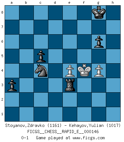Last move : 0-1 2015 March 30 10:53:28 [Event "FICGS__CHESS__RAPID_E__000146"] [Site "FICGS"] [Date "2015.02.01"] [Round "1"] [White "Stoyanov,Zdravko"] [Black "Kehayov,Yulian"] [Result "0-1"] [WhiteElo "1161"] [BlackElo "1017"] 1.e4 d6 2.Nf3 e5 3.h3 Nf6 4.d3 g6 5.a3 Bg7 6.Bg5 O-O 7.Be2 Nc6 8.O-O d5 9.exd5 Ne7 10.Nxe5 Nexd5 11.c4 Qd6 12.Nf3 Nd7 13.Qc1 Nc5 14.cxd5 Qxd5 15.Be3 Nb3 16.Qc4 Qxc4 17.dxc4 Nxa1 18.Nc3 Nc2 19.Bf4 c6 20.Bd3 Bxc3 21.bxc3 Bf5 22.Bxf5 Nxa3 23.Bd3 b5 24.cxb5 Nxb5 25.c4 Nc3 26.Rc1 Na4 27.Be4 Rac8 28.Bc2 Nb6 29.Ne5 Rfd8 30.Bb3 c5 31.Bg5 Re8 32.Bf6 Rc7 33.Rd1 h5 34.Kf1 a5 35.Ba2 Na4 36.Bb3 Nc3 37.Rd3 Ne4 38.Rf3 Nxf6 39.Nxg6 Ne4 40.Re3 Nd2+ 41.Kg1 Rxe3 42.fxe3 fxg6 43.Ba2 Rb7 44.Kf2 Rb2 45.Kg3 Rxa2 46.Kf4 Nxc4 47.g4 hxg4 48.hxg4 Re2 49.e4 a4 50.Kf3 Re3+ 51.Kf4 a3 0-1 King's pawn Opening Kingside Castling by player Black (move 6) Kingside Castling by player White (move 8) 10 pieces endgame at move 47 : White KPP , Black KRNPPPP WHITE : King + 2 Pawns BLACK : King + 1 Rook 1 Knight 4 Pawns 9 pieces endgame at move 48 : White KPP , Black KRNPPP WHITE : King + 2 Pawns BLACK : King + 1 Rook 1 Knight 3 Pawns Player Black won this chess game. Follow this game move after move (download)Even the laziest King flees wildly in the face of a double check ! (Aaron Nimzowitsch) Du musst nicht gut spielen, es reicht, wenn du besser spielst als dein Gegner. (Anonymous) La señal de un Gran Maestro es su habilidad de ganar una partida rápidamente y sin dolor. (Irving Chernev) Ce n'est pas pour s'amuser qu'il joue aux échecs : il célèbre un culte. (Vladimir Nabokov) You cannot beat a roulette table unless you steal money from it. (Albert Einstein)