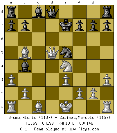 Last move : 0-1 2015 March 22 18:0:25 [Event "FICGS__CHESS__RAPID_E__000146"] [Site "FICGS"] [Date "2015.02.01"] [Round "1"] [White "Bromo,Alexis"] [Black "Salinas,Marcelo"] [Result "0-1"] [WhiteElo "1137"] [BlackElo "1167"] 1.d4 e6 2.a3 Nh6 3.c4 Ng4 4.Nf3 d5 5.e3 Nc6 6.Nc3 e5 7.dxe5 Ncxe5 8.Nxe5 Nxe5 9.h3 c6 10.cxd5 cxd5 11.Qxd5 Bd6 12.Bb5+ Ke7 13.Ne4 Bb4+ 0-1 Queen's pawn Player Black won this chess game. Follow this game move after move (download)It's always better to sacrifice your opponent's men. (Savielly Tartakover) Auf Remis zu spielen ist gewissermaßen ein Verbrechen gegen das Schachspiel. (Mikhail Nekhemyevich Tal) El Ajedrez se juega con la mente... ¡no con las manos!. (Renaud y Kahn) Si le désir cupide (et stupide) de gagner est une inépuisable source de souffrance, une combinaison brillante sur l'échiquier est une découverte : le coquelicot qui s'épanouit lorsque apparaît la Voie Lactée. (Arrabal) The various flowers seem good to different people. (Chinese proverb)