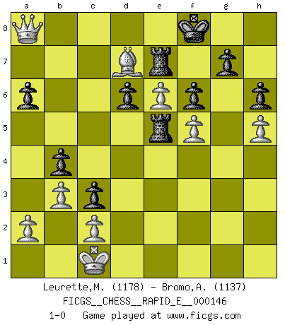 Last move : 1-0 2015 March 18 20:50:19 [Event "FICGS__CHESS__RAPID_E__000146"] [Site "FICGS"] [Date "2015.02.01"] [Round "1"] [White "Leurette,Marc-Antoine"] [Black "Bromo,Alexis"] [Result "1-0"] [WhiteElo "1178"] [BlackElo "1137"] 1.e4 e5 2.Nf3 Nc6 3.Bc4 h6 4.d4 d6 5.d5 Nce7 6.Nc3 a6 7.Be3 Nf6 8.h3 Ng6 9.Qd2 Be7 10.g3 O-O 11.O-O-O Bd7 12.Kb1 b5 13.Bd3 Re8 14.h4 Ng4 15.h5 Nf8 16.Nh2 Nxe3 17.Qxe3 Nh7 18.f4 exf4 19.gxf4 c6 20.f5 Bg5 21.Qg3 f6 22.Nf3 Qe7 23.Nh4 Bxh4 24.Qxh4 Ng5 25.Qg4 c5 26.Rde1 c4 27.Bf1 Rac8 28.Bg2 b4 29.Ne2 Nxe4 30.Nd4 Nd2+ 31.Kc1 Qxe1+ 32.Rxe1 Rxe1+ 33.Kxd2 Rce8 34.Ne6 Bxe6 35.dxe6 Re5 36.Bc6 Re7 37.Bd7 Rd5+ 38.Kc1 c3 39.b3 Kf8 40.Qf3 Re5 41.Qa8+ 1-0 King's pawn game Kingside Castling by player Black (move 10) Queenside Castling by player White (move 11) Player White won this chess game. Follow this game move after move (download)Chess is the art which expresses the science of logic. (Mikhail Botvinnik) Im Leben werden Partien nie so unstrittig gewonnen wie im Spiel (Emanuel Lasker) Te sientas frente a un tablero y repentinamente tu corazón brinca. Tu mano tiembla al tomar una pieza y moverla. Pero lo que el Ajedrez te enseña es que tu debes permanecer ahí con calma y pensar de que si realmente es una buena idea o de que si hay otras ideas mejores. (Stanley Kubrick) Aucun coup ne doit être joué sans but. (Pedro Damiano) Somewhere in the world there is an epigram for every dilemma. (Hendrik Willem van Loon)