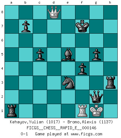 Last move : 0-1 2015 May 8 22:8:16 [Event "FICGS__CHESS__RAPID_E__000146"] [Site "FICGS"] [Date "2015.02.01"] [Round "1"] [White "Kehayov,Yulian"] [Black "Bromo,Alexis"] [Result "0-1"] [WhiteElo "1017"] [BlackElo "1137"] 1.e4 e5 2.Nf3 Nc6 3.d4 d6 4.d5 Nce7 5.c4 h6 6.Be2 Bg4 7.O-O f5 8.Nc3 f4 9.h3 Bxf3 10.Bxf3 g5 11.b3 a6 12.Bb2 Nf6 13.a3 c5 14.b4 Nd7 15.b5 axb5 16.Nxb5 Nb6 17.Rc1 Ng6 18.Bh5 Kf7 19.Qg4 Qf6 20.Bxg6+ Qxg6 21.Qf5+ Qxf5 22.f3 Be7 23.Nxd6+ Bxd6 24.Kh2 h5 25.g4 Qd7 26.Rc2 hxg4 27.fxg4 Qxg4 28.Rg2 Rxh3+ 29.Kg1 Qh5 30.Kf2 Qf3+ 31.Kg1 Qxe4 32.R1f2 Nxc4 33.Bxe5 Bxe5 34.d6 R8xa3 35.d7 Ra1+ 36.Rf1 Ne3 37.d8Q Qxg2+ 0-1 Scotch Opening Kingside Castling by player White (move 7) Promotion Queen by player White (move 37) Player Black won this chess game. Follow this game move after move (download)Dazzling combinations are for the many, shifting wood is for the few. (Georg Kieninger) Fischer ist das größte Genie, das je vom Schachhimmel heruntergestiegen ist. (Mikhail Nekhemyevich Tal) Alguna parte de un error es siempre correcto. (Savielly Tartakover) Les écrivains ont utilisé les échecs pour analyser les côtés extrêmes de la nature humaine. Dans ce cadre, les échecs offrent un champ d'expérimentation idéal. Mais on pourrait faire la même chose avec la peinture. Et là, en vous référant à Van Gogh, vous ne tirerez pas de conclusion définitive sur les peintres. (Gary Kasparov) Life is like a play: it's not the length but the excellence of the acting that matters. (Seneca)