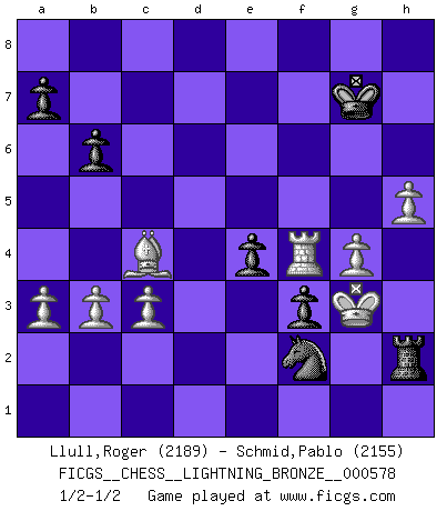 Last move : 1/2-1/2 2015 February 3 0:42:19 [Event "FICGS__CHESS__LIGHTNING_BRONZE__000578"] [Site "FICGS"] [Date "2015.02.02"] [Round "1"] [White "Llull,Roger"] [Black "Schmid,Pablo"] [Result "1/2-1/2"] [WhiteElo "2189"] [BlackElo "2155"] 1.e4 c5 2.Nc3 Nc6 3.Nge2 g6 4.d4 cxd4 5.Nxd4 Bg7 6.Be3 Nf6 7.Be2 O-O 8.f4 d6 9.O-O Qb6 10.Qd3 Ng4 11.Bxg4 Bxd4 12.Bxd4 Qxd4+ 13.Qxd4 Nxd4 14.Bd1 e6 15.Nb1 e5 16.c3 Ne6 17.f5 gxf5 18.exf5 Nf4 19.g3 Nd5 20.Na3 Ne3 21.Rf2 Nxf5 22.Bc2 Ng7 23.Nc4 Ne8 24.Rd2 Be6 25.Nxd6 Rd8 26.Ne4 Rxd2 27.Nxd2 f6 28.Ne4 Kf7 29.Nc5 b6 30.Nxe6 Kxe6 31.Bxh7 f5 32.Bg6 Nd6 33.Rf1 Nc4 34.b3 Nd2 35.Rf2 Ne4 36.Rf3 Ng5 37.Rf1 e4 38.Bh5 Ke5 39.Rd1 Rh8 40.Be2 f4 41.Rd7 f3 42.Bc4 Kf5 43.h4 Nh3+ 44.Kh2 Nf2 45.Rf7+ Ke5 46.Re7+ Kf5 47.Rf7+ Kg6 48.Rf4 Rd8 49.g4 Rd2 50.Kg3 Nh1+ 51.Kh3 Rg2 52.h5+ Kg7 53.Kh4 Nf2 54.a3 Rh2+ 55.Kg3 1/2-1/2 Sicilian : chameleon variation Kingside Castling by player Black (move 7) Kingside Castling by player White (move 9) This chess game ended in a draw. Follow this game move after move (download)The Chess pieces are the block alphabet which shapes thoughts; and these thoughts, although making a visual design on the chessboard, express their beauty abstractly, like a poem. (Marcel Duchamp) Mein Gehirn das ist mein zweitwichtigstes Organ [Aus dem Film: Der Schläfer]. (Woody Allen) No hay un Gran Maestro de Ajedrez que sea normal; solo se diferencían ellos por la magnitud de su locura. (Viktor Korchnoi) Toutes les manuvres exécutées sur une colonne ouverte ont pour but ultime l'intrusion définitive sur la septième ou la huitième rangée, en plein cur de la position ennemie. (Aaron Nimzovitch) When the going gets tactical, the computers get going. (Hyatt)