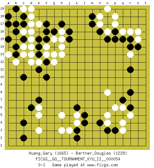 Last move : 0-1 2015 June 13 0:50:4 [Event "FICGS__GO__TOURNAMENT_KYU_II__000054"] [Site "FICGS"] [Date "2015.02.04"] [Round "1"] [Black "Huang,Gary"] [White "Bartner,Douglas"] [Result "0-1"] [Rating 1 "1665"] [Rating 2 "1228"] 1.q15 q4 2.o3 q3 3.k3 e3 4.r6 o4 5.n4 o5 6.p3 q6 7.q7 p6 8.r8 r5 9.c4 h3 10.c2 e5 11.d6 e6 12.e7 h5 13.k6 k4 14.l4 k5 15.l5 j3 16.k2 d16 17.f17 d17 18.j16 d13 19.b13 c13 20.b14 b12 21.c15 d15 22.c18 d18 23.c17 c16 24.b16 b18 25.b17 c19 26.a15 c14 27.a17 a13 28.b19 d19 29.a18 r13 30.r11 r16 31.r15 q16 32.p16 s15 33.s14 s16 34.r14 p17 35.o17 o16 36.p15 n17 37.o18 p18 38.n16 n18 39.o15 o19 40.c10 o8 41.m17 g15 42.g16 h15 43.j15 h16 44.h17 h13 45.f15 f14 46.g14 h14 47.e14 f13 48.e15 d14 49.e13 e12 50.f12 g13 51.e11 d12 52.f10 e17 53.f16 b15 54.m18 o16 55.c15 g12 0-1 This go game has been lost on time (started : 2015.02.04 17:11:23) Here are the names of the openings (joseki) played in the four corners : Corner q4 : q4 o3 Hoshi (Hwajeom, Seongjeom, Xingwei`) 4-4 Point. The star or hoshi (4-4) point, emphasizing influence at the potential expense of territory. Ikken Kakari (Hankan Keolch'im, Yi Gua`jiao~, 1-Space Low Approach). Black 2 is the standard approach move to the 4-4. Corner d4 : e3 c4 Mokuhazushi (Waemok, Wai`mu`) 5-3 Point. The mokuhazushi (5-3) point was popular in the Edo period in Japan (1600 - 1867). It emphasizes influence; territorially, it is inferior to the 3-4 point. Komoku Kakari. Black 2 is the standard approach because of its solidity and stability. Corner d16 : d16 f17 Hoshi (Hwajeom, Seongjeom, Xingwei`) 4-4 Point. The star or hoshi (4-4) point, emphasizing influence at the potential expense of territory. Ikken Kakari (Hankan Keolch'im, Yi Gua`jiao~, 1-Space Low Approach). Black 2 is the standard approach move to the 4-4. Corner q16 : q15 r13 Takamoku (Gomok, Gaomu`) 5-4 Point. The takamoku (high) point (5-4). With its emphasis on influence, the 5-4 point complements the 4-4 (hoshi) point in creating an influence-oriented fuseki. Player White won this Go (weiqi, baduk) game. Follow this game move after move (download)Keshi is worth as much as an invasion ! (Anonymous) Somehow our devils are never quite what we expect when we meet them face to face. (Nelson DeMille)