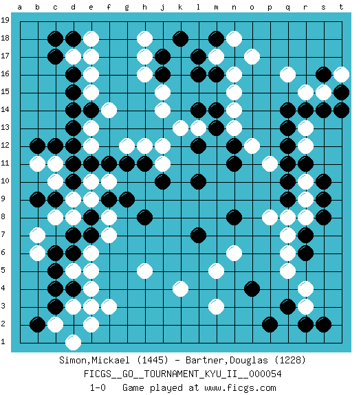 Last move : 1-0 2015 March 30 20:37:2 [Event "FICGS__GO__TOURNAMENT_KYU_II__000054"] [Site "FICGS"] [Date "2015.02.04"] [Round "1"] [Black "Simon,Mickael"] [White "Bartner,Douglas"] [Result "1-0"] [Rating 1 "1445"] [Rating 2 "1228"] 1.q3 q16 2.c4 d17 3.r14 o17 4.q10 q5 5.o4 r3 6.r2 r4 7.p2 r8 8.d15 e16 9.c17 e15 10.d14 h16 11.e3 k4 12.d10 e12 13.d12 e13 14.d13 j14 15.l16 n15 16.l14 n13 17.l12 j12 18.l10 r12 19.q12 r13 20.q13 e5 21.d6 e6 22.d7 d5 23.c5 f3 24.e11 f8 25.g11 g12 26.h11 h12 27.h8 h5 28.e14 f14 29.r11 r15 30.s14 s15 31.q14 m3 32.k18 h18 33.r6 q6 34.r7 q7 35.s8 r9 36.s9 p8 37.q9 q8 38.n8 r10 39.s10 n6 40.l7 m5 41.d18 e18 42.d16 e17 43.c18 j11 44.j10 l13 45.m13 k13 46.m14 n14 47.n12 m17 48.j16 j15 49.j17 h17 50.l17 e2 51.d2 d3 52.d4 e4 53.c3 e3 54.m18 n18 55.m16 n16 56.s2 o12 57.n11 p11 58.q11 c2 59.b2 d1 60.t15 t16 61.t14 c8 62.s16 d8 63.e7 f7 64.e8 e9 65.c6 d9 66.f9 f10 67.g9 e10 68.f11 c10 69.d11 c11 70.b9 b7 71.c12 b6 72.c9 b11 73.b12 1-0 Here are the names of the openings (joseki) played in the four corners : Corner q16 : q16 r14 Hoshi (Hwajeom, Seongjeom, Xingwei`) 4-4 Point. The star or hoshi (4-4) point, emphasizing influence at the potential expense of territory. Ikken Kakari (Hankan Keolch'im, Yi Gua`jiao~, 1-Space Low Approach). Black 2 is the standard approach move to the 4-4. Corner q4 : q3 q5 Komoku (Somok, Xiao~mu`) 3-4 Point. The komoku (3-4) point is the traditional corner enclosure move.. Ikken Takagakari (Hankan Nop'dakeolch'im, Yi Gaogua`jiao~, 1-Space High Approach). The 5-4 approach move has become more popular in modern times, as modern Go emphasizes speed and influence. Corner d16 : d17 d15 Komoku (Somok, Xiao~mu`) 3-4 Point. The komoku (3-4) point is the traditional corner enclosure move.. Ikken Takagakari (Hankan Nop'dakeolch'im, Yi Gaogua`jiao~, 1-Space High Approach). The 5-4 approach move has become more popular in modern times, as modern Go emphasizes speed and influence. Player Black won this Go (weiqi, baduk) game. Follow this game move after move (download)The game plays itself, the players don't control it. (Pierre Audouard) I take risks, sometimes patients die, but not taking risks causes more patients to die. So I guess my biggest problem is I've been cursed with the ability to do the math. (Gregory House, House M.D.)