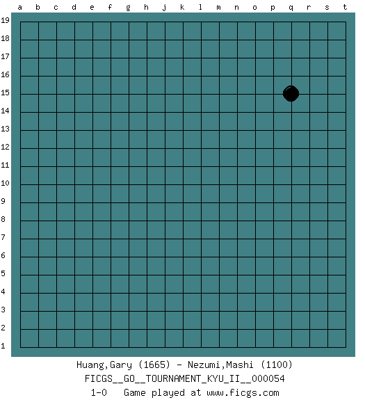 Last move : 1-0 2015 March 8 13:1:42 [Event "FICGS__GO__TOURNAMENT_KYU_II__000054"] [Site "FICGS"] [Date "2015.02.04"] [Round "1"] [Black "Huang,Gary"] [White "Nezumi,Mashi"] [Result "1-0"] [Rating 1 "1665"] [Rating 2 "1100"] 1.q15 1-0 This go game has been lost on time (started : 2015.02.04 17:11:23) Here are the names of the openings (joseki) played in the four corners : Player Black won this Go (weiqi, baduk) game. Follow this game move after move (download)It is difficult to know exactly what you are doing. (Pierre Audouard) Mandala - that's it! 16x16 squares as multiple of the four and the eight because of the Four Noble Truths and the Noble Eightfold Path. (Heinz-Georg Lehnhoff about Big Chess)