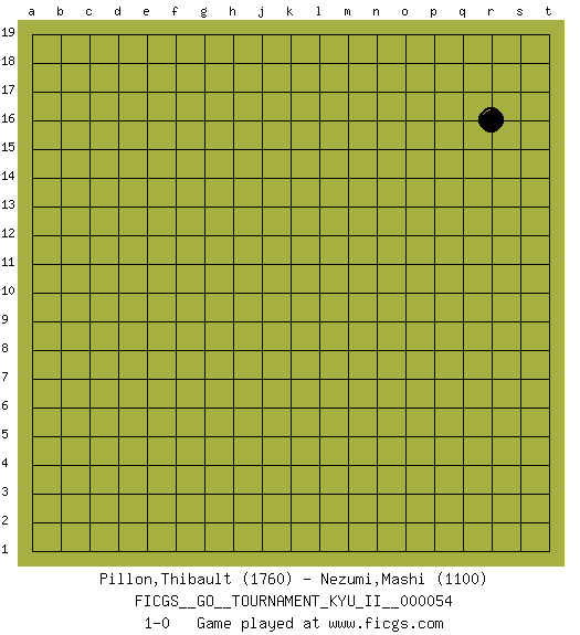 Last move : 1-0 2015 March 8 0:57:43 [Event "FICGS__GO__TOURNAMENT_KYU_II__000054"] [Site "FICGS"] [Date "2015.02.04"] [Round "1"] [Black "Pillon,Thibault"] [White "Nezumi,Mashi"] [Result "1-0"] [Rating 1 "1760"] [Rating 2 "1100"] 1.r16 1-0 This go game has been lost on time (started : 2015.02.04 17:11:23) Here are the names of the openings (joseki) played in the four corners : Player Black won this Go (weiqi, baduk) game. Follow this game move after move (download)Beginner's games are surprising, often incoherent and incomprehensible. When you improve, your game gains in consistency but flirts with stupidity: you become satisfied with truisms and mechanical movements, you try to obtain a feeling for clearness and style the easy way. (Pierre Audouard) Rules and bones are meant to be broken. (Anonymous)