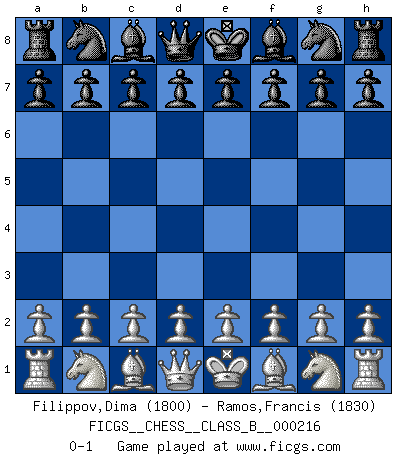 Last move : 0-1 2015 March 20 14:21:35 [Event "FICGS__CHESS__CLASS_B__000216"] [Site "FICGS"] [Date "2015.02.07"] [Round "1"] [White "Filippov,Dima"] [Black "Ramos,Francis"] [Result "0-1"] [WhiteElo "1800"] [BlackElo "1830"] 0-1 This chess game has been lost on time (started : 2015.02.07 12:30:56) Player Black won this chess game. Follow this game move after move (download)Chess is so inspiring that I do not believe a good player is capable of having an evil thought during the game. (Wilhelm Steinitz) Intelligenz läßt sich nicht am Weg, sondern nur am Ergebnis feststellen. (Garry Kasparov) La maestría del Ajedrez consiste esencialmente en analizar posiciónes de Ajedrez con precisión. (Mikhail Botvinnik) Si rien de grave n'est détecté lors de l'analyse d'une position, on joue alors le coup. Seconde règle de Blumenfeld. The beginning of wisdom is silence. The second step is listening. (Unknown)