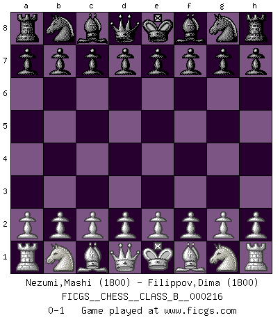 Last move : 0-1 2015 March 20 14:21:35 [Event "FICGS__CHESS__CLASS_B__000216"] [Site "FICGS"] [Date "2015.02.07"] [Round "1"] [White "Nezumi,Mashi"] [Black "Filippov,Dima"] [Result "0-1"] [WhiteElo "1800"] [BlackElo "1800"] 0-1 This chess game has been lost on time (started : 2015.02.07 12:30:56) Player Black won this chess game. Follow this game move after move (download)No Chess Grandmaster is normal; they only differ in the extent of their madness. (Viktor Korchnoi) Bis zum Jahr 1971 verlief in meiner Schachkariere alles glatt. Dieses dramatische Match [Fischer-Taimanov 6:0] machte mein Leben zur Hölle. (Mark Taimanov) Bobby Fischer es el jugador de Ajedrez mas grande que jamás haya existido. (Ken Smith) Je fais ceci parce que dans cinquante coups j'obtiendrai cela; je m'appelle Mikhail Moisevitch Botvinnik. (Botvinnik) All war is based on deception. (Sun Tzu)