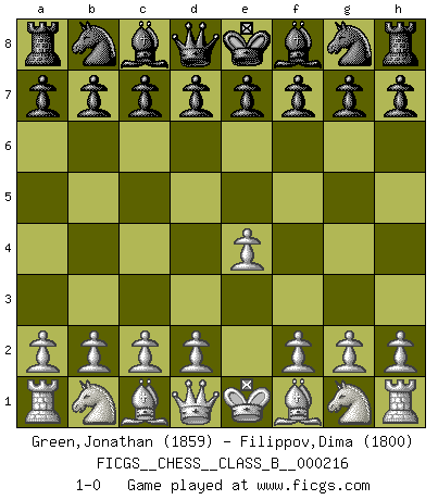 Last move : 1-0 2015 March 21 14:29:40 [Event "FICGS__CHESS__CLASS_B__000216"] [Site "FICGS"] [Date "2015.02.07"] [Round "1"] [White "Green,Jonathan"] [Black "Filippov,Dima"] [Result "1-0"] [WhiteElo "1859"] [BlackElo "1800"] 1.e4 1-0 This chess game has been lost on time (started : 2015.02.07 12:30:56) King's pawn Opening Player White won this chess game. Follow this game move after move (download)Chess is as much a mystery as women. (Purdy) Schach ist mein Leben, meine Leidenschaft, was ich gelernt habe und seit meinem 14. Lebensjahr profimässig praktiziere. Darauf zu verzichten, würde mir sehr schwer fallen. (Viktor Kortschnoi) El Ajedrez es una hermosa aventura. (Bent Larsen) Je crois qu'il existe des manières très spécifiques de jouer efficacement contre une machine. Evidemment, nous n'avons aucune chance en technique pure, parce que l'ordinateur calcule de manière parfaite. Mais lorsque nous faisons appel à notre cerveau, en utilisant l'intuition et la compréhension, alors nous restons beaucoup plus forts. (Anatoli Karpov) Success without honor is an unseasoned dish; it will satisfy your hunger, but it won't taste good. (Joe Paterno)