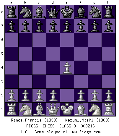 Last move : 1-0 2015 March 22 2:40:22 [Event "FICGS__CHESS__CLASS_B__000216"] [Site "FICGS"] [Date "2015.02.07"] [Round "1"] [White "Ramos,Francis"] [Black "Nezumi,Mashi"] [Result "1-0"] [WhiteElo "1830"] [BlackElo "1800"] 1.e4 1-0 This chess game has been lost on time (started : 2015.02.07 12:30:56) King's pawn Opening Player White won this chess game. Follow this game move after move (download)Dazzling combinations are for the many, shifting wood is for the few. (Georg Kieninger) Wer nie einen Fehler gemacht hat, hat nie etwas Neues ausprobiert. (Albert Einstein) Un jugador que trata de regresar una movida en el Ajedrez es un futuro carterista. (Richard Fenton) Horreur, mais aussi harmonie suprême : qu'y avait-il en effet au monde en dehors des échecs ? Le brouillard, l'inconnu, le non-être... (Vladimir Nabokov) There's no money in correspondence chess. (John Knudsen)