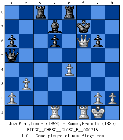 Last move : 1-0 2015 May 11 14:49:9 [Event "FICGS__CHESS__CLASS_B__000216"] [Site "FICGS"] [Date "2015.02.07"] [Round "1"] [White "Jozefini,Lubor"] [Black "Ramos,Francis"] [Result "1-0"] [WhiteElo "1969"] [BlackElo "1830"] 1.e4 c5 2.Nf3 d6 3.d4 cxd4 4.Nxd4 Nf6 5.f3 a6 6.c4 g6 7.Be3 Bg7 8.Nc3 O-O 9.Be2 Nc6 10.Qd2 Nxd4 11.Bxd4 Be6 12.b3 Rc8 13.O-O Re8 14.Rad1 Qa5 15.f4 b5 16.Qb2 bxc4 17.f5 Bd7 18.Bxc4 Bh6 19.Bxf6 exf6 20.fxg6 hxg6 21.Nd5 Bg7 22.Nxf6+ Bxf6 23.Bxf7+ Kxf7 24.Qxf6+ 1-0 Sicilian : Prins (Moscow) variation Kingside Castling by player Black (move 8) Kingside Castling by player White (move 13) Player White won this chess game. Follow this game move after move (download)By playing at Chess then, we may learn: First: Foresight... Second: Circumspection... Third: Caution... And lastly, we learn by Chess the habit of not being discouraged by present bad appearances in the state of our affairs, the habit of hoping for a favorable chance, and that of persevering in the secrets of resources. (Benjamin Franklin) Die Partien sind immer verschieden, die Interviews immer die gleichen. (Garry Kasparov) No hay precio que sea tan grande por la cabellera del Rey enemigo. (Koblentz) Mon pion favori sur ma case favorite ! Bronstein en parlant d'un coup de pion en h5 quand il avait les Noirs. The Internet isn't free. It just has an economy that makes no sense to capitalism. (Brad Shapcott)
