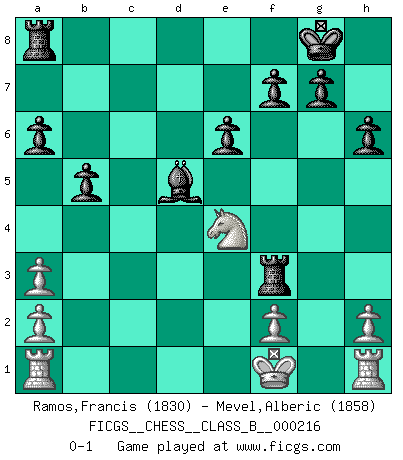 Last move : 0-1 2015 May 21 16:29:27 [Event "FICGS__CHESS__CLASS_B__000216"] [Site "FICGS"] [Date "2015.02.07"] [Round "1"] [White "Ramos,Francis"] [Black "Mevel,Alberic"] [Result "0-1"] [WhiteElo "1830"] [BlackElo "1858"] 1.e4 c5 2.Nf3 e6 3.d4 cxd4 4.Nxd4 Nc6 5.Nb5 d6 6.N1c3 a6 7.Na3 b5 8.Ne2 Nf6 9.Bg5 h6 10.Bxf6 Qxf6 11.c3 Bb7 12.Ng3 d5 13.Be2 Bxa3 14.bxa3 Qxc3+ 15.Kf1 O-O 16.Bf3 Ne5 17.Qc1 Rfc8 18.Qxc3 Rxc3 19.exd5 Nxf3 20.gxf3 Bxd5 21.Ne4 Rxf3 0-1 Sicilian, Szen (`anti-Taimanov') variation Kingside Castling by player Black (move 15) Player Black won this chess game. Follow this game move after move (download)Alekhine is a poet who creates a work of art out of something that would hardly inspire another man to send home a picture post card. (Max Euwe) Bobby Fischer ist kein Vorbild für die heutige Jugend. (Viktor Kortschnoi) El Ajedrez demanda una total concentración. (Bobby Fischer) Les pièces de l'échiquier étaient impitoyables. Elles le retenaient, elles l'absorbaient. Il y avait de l'horreur en cela, mais aussi une harmonie unique. Car, qu'y a-t-il dans le monde, à part les échecs ? (V. Nabokov) The ultimate in disposing one's troops is to be without ascertainable shape. Then the most penetrating spies cannot pry in nor can the wise lay plans against you. (Sun Tzu)