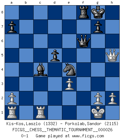 Last move : 0-1 2007 September 1 3:5:34 [Event "FICGS__CHESS__THEMATIC_TOURNAMENT__000026"] [Site "FICGS"] [Date "2007.03.01"] [Round "1"] [White "Kis-Kos,Laszlo"] [Black "Porkolab,Sandor"] [Result "0-1"] [WhiteElo "1332"] [BlackElo "2115"] 1.e4 e5 2.Nf3 Nc6 3.Bc4 Bc5 4.b4 Bxb4 5.c3 Ba5 6.d4 exd4 7.O-O Nf6 8.e5 Ne4 9.cxd4 d5 10.Bb5 O-O 11.Bxc6 bxc6 12.Qa4 Bb6 13.Qxc6 Rb8 14.Be3 f5 15.Nc3 Bb7 16.Qe6+ Kh8 17.Ne2 c6 18.Nf4 Qc7 19.Nh4 Rbe8 20.Nhg6+ hxg6 21.Qxg6 Kg8 22.Qh5 Ba6 23.Rfc1 Bc4 24.Ng6 f4 25.Nxf4 c5 26.dxc5 Bxc5 27.e6 Bxe3 28.fxe3 Qb6 29.Re1 Rxe6 30.Nxe6 Qxe6 31.Rec1 Qf6 0-1 Evans gambit Kingside Castling by player White (move 7) Kingside Castling by player Black (move 10) Player Black won this chess game. Follow this game move after move (download)Chess, like love, is infectious at any age. (Flohr) Bis zum Jahr 1971 verlief in meiner Schachkariere alles glatt. Dieses dramatische Match [Fischer-Taimanov 6:0] machte mein Leben zur Hölle. (Mark Taimanov) El juego del Ajedrez no es solamente una diversión quieta; algunas cualidades muy valuables de la mente se pueden adquirir y cultivar con el, como convertirlos en habitos disponibles para toda ocasión; ya que la vida es algo así como el Ajedrez. (Benjamin Franklin) Je fais ceci parce que dans cinquante coups j'obtiendrai cela; je m'appelle Mikhail Moisevitch Botvinnik. (Botvinnik) Now the reason the enlightened prince and the wise general conquer the enemy whenever they move and their achievements surpass those of ordinary men is foreknowledge. (Sun Tzu)