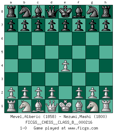 Last move : 1-0 2015 March 20 14:21:35 [Event "FICGS__CHESS__CLASS_B__000216"] [Site "FICGS"] [Date "2015.02.07"] [Round "1"] [White "Mevel,Alberic"] [Black "Nezumi,Mashi"] [Result "1-0"] [WhiteElo "1858"] [BlackElo "1800"] 1.e4 1-0 This chess game has been lost on time (started : 2015.02.07 12:30:56) King's pawn Opening Player White won this chess game. Follow this game move after move (download)Some part of a mistake is always correct. (Savielly Tartakover) Die Auseinandersetzung mit Karpow war politisch geprägt. Er stand für das kommunistische System, wurde von dessen Repräsentanten gehätschelt. Ich war der Oppositionelle. Jeder Schachweltmeister spiegelt auch die gesellschaftlichen Verhältnisse wider. Kramnik steht für die Börsen-Generation des Neuen Markts, ideologiefrei, zahlenfixiert. (Garry Kasparov) El Ajedrez es parte de la cultura, y si una cultura esta en decadencia, entonces también el Ajedrez declinará. (Mikhail Botvinnik) Un journaliste : 'Vous préférez avoir une dame de plus sur l'échiquier ou au lit ?' Boris Spassky : 'Ca dépend de la position.' For peace of mind, resign as general manager of the universe. (Douglas Adams)