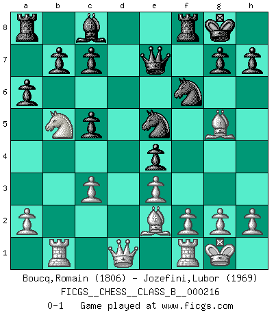Last move : 0-1 2015 June 16 1:24:32 [Event "FICGS__CHESS__CLASS_B__000216"] [Site "FICGS"] [Date "2015.02.07"] [Round "1"] [White "Boucq,Romain"] [Black "Jozefini,Lubor"] [Result "0-1"] [WhiteElo "1806"] [BlackElo "1969"] 1.c4 f5 2.Nc3 Nf6 3.d3 Nc6 4.Nf3 e5 5.Bg5 Bb4 6.e3 O-O 7.Be2 e4 8.dxe4 fxe4 9.Nd4 Ne5 10.O-O Bxc3 11.bxc3 d6 12.Rb1 Qe7 13.c5 dxc5 14.Nb5 a6 0-1 This chess game has been lost on time (started : 2015.02.07 12:30:56) English : Anglo-Dutch defense Kingside Castling by player Black (move 6) Kingside Castling by player White (move 10) Player Black won this chess game. Follow this game move after move (download)Chess is thirty to forty percent psychology. You don't have this when you play a computer. I can't confuse it. (Judith Polgar) Das Schachspiel ist ein See, in welchem eine Mücke baden und ein Elefant ertrinken kann. (Emanuel Lasker) El Ajedrez es el gimnasio de la mente. (Blaise Pascal) Il n'y a pas de prix trop élevé au scalp de l'ennemi. (Koblentz) Art disturbs, science reassures. (Georges Braque, Le Jour et la Nuit)