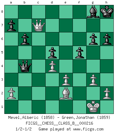 Last move : 1/2-1/2 2015 August 13 22:1:7 [Event "FICGS__CHESS__CLASS_B__000216"] [Site "FICGS"] [Date "2015.02.07"] [Round "1"] [White "Mevel,Alberic"] [Black "Green,Jonathan"] [Result "1/2-1/2"] [WhiteElo "1858"] [BlackElo "1859"] 1.d4 f5 2.Bg5 g6 3.Nd2 h6 4.Bh4 Bg7 5.e3 Nf6 6.f4 O-O 7.Ngf3 c5 8.c3 d5 9.Ne5 Kh7 10.Be2 Be6 11.O-O Nbd7 12.Bxf6 Nxf6 13.dxc5 Qc7 14.b4 Nd7 15.Nef3 Bg8 16.Nd4 e5 17.Nb5 Qd8 18.fxe5 Nxe5 19.Nf3 b6 20.Nxe5 Bxe5 21.c6 Rf6 22.Nd4 Bxd4 23.cxd4 Rxc6 24.Qd2 Rac8 25.Rfc1 Qe7 26.g3 Rxc1+ 27.Rxc1 Rxc1+ 28.Qxc1 Qxb4 29.Qc7+ Kh8 1/2-1/2 Dutch, 2.Bg5 variation Kingside Castling by player Black (move 6) Kingside Castling by player White (move 11) This chess game ended in a draw. Follow this game move after move (download)Winning isn't everything... but losing is nothing. (Mednis) Schach ist ein Kampf gegen den Fehler. (Johannes Herrman Zukertort) Dios mío, Bobby Fischer juega tan simple. (Alexei Suetin) Je ne crois pas en la psychologie, je crois aux bons coups. (Robert Fischer) To be champion requires more than simply being a strong player; one has to be a strong human being as well. (Anatoly Karpov)