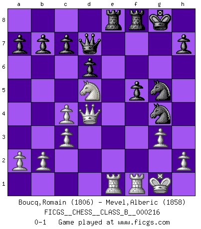 Last move : 0-1 2015 July 3 2:55:48 [Event "FICGS__CHESS__CLASS_B__000216"] [Site "FICGS"] [Date "2015.02.07"] [Round "1"] [White "Boucq,Romain"] [Black "Mevel,Alberic"] [Result "0-1"] [WhiteElo "1806"] [BlackElo "1858"] 1.c4 e5 2.Nc3 Nf6 3.g3 Bb4 4.Bg2 O-O 5.e3 Bxc3 6.dxc3 e4 7.Ne2 Nc6 8.O-O d6 9.Nf4 Bg4 10.f3 exf3 11.Bxf3 Ne5 12.Bxg4 Nexg4 13.e4 Qd7 14.Nd5 Nxe4 15.Bf4 Rae8 16.Qd4 f5 17.Rae1 g5 18.Bxg5 Nxg5 0-1 This chess game has been lost on time (started : 2015.02.07 12:30:56) English : Bremen, Smyslov system Kingside Castling by player Black (move 4) Kingside Castling by player White (move 8) Player Black won this chess game. Follow this game move after move (download)Tactics flow from a superior position. (Bobby Fischer) Im Spitzenschach von heute geht es nur um Vorbereitung, um tiefgründige, sorgfältige Eröffnungsvorbereitung. (Nigel Short) El Ajedrez es en su esencia, un juego. En su forma, un arte. Y en su ejecución, una ciencia. (Baron Tassilo) Même si l'adversaire joue le coup analysé précédemment, recommencez l'analyse en voyant la nouvelle position. Première règle de Blumenfeld However beautiful the strategy, you should occasionally look at the results. (Winston Churchill)