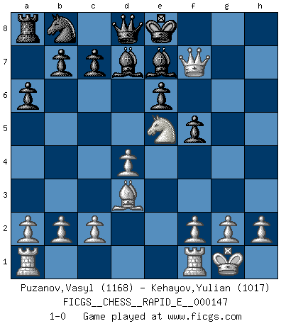 Last move : 1-0 2015 April 29 22:8:31 [Event "FICGS__CHESS__RAPID_E__000147"] [Site "FICGS"] [Date "2015.02.09"] [Round "1"] [White "Puzanov,Vasyl"] [Black "Kehayov,Yulian"] [Result "1-0"] [WhiteElo "1168"] [BlackElo "1017"] 1.e4 d5 2.exd5 Qxd5 3.Nc3 Qd8 4.d4 e6 5.Nf3 Nf6 6.Bd3 h6 7.O-O Be7 8.Bf4 a6 9.Ne4 Nxe4 10.Bxe4 O-O 11.Qd2 Bd7 12.Bxh6 gxh6 13.Qxh6 f5 14.Bd3 Rf6 15.Qg5+ Kf7 16.Ne5+ Ke8 17.Qh5+ Rf7 18.Qxf7+ 1-0 Scandinavian (centre counter) defense Kingside Castling by player White (move 7) Kingside Castling by player Black (move 10) Player White won this chess game. Follow this game move after move (download)Chess is in its essence a game, in its form an art, and in its execution a science. (Baron Tassilo) Bogoljubow: Matt in vier Zügen! Tartakower: Ich verbitte mir jede Belästigung! (Savielly Grigorievitsch Tartakower) Aquel que ve no otra dirección en el juego que la de dar Jaque Mate a su oponente, nunca será un buen jugador de Ajedrez. (Euwe) La vérité est comme le meilleur coup aux échecs : elle existe, mais il faut la chercher. (Arturo Perez-Reverte) Creativity is allowing yourself to make mistakes. Art is knowing which ones to keep. (Scott Adams)