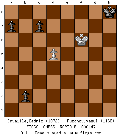 Last move : 0-1 2015 May 23 10:56:56 [Event "FICGS__CHESS__RAPID_E__000147"] [Site "FICGS"] [Date "2015.02.09"] [Round "1"] [White "Cavaille,Cedric"] [Black "Puzanov,Vasyl"] [Result "0-1"] [WhiteElo "1072"] [BlackElo "1168"] 1.d4 d5 2.c4 e6 3.Nf3 Nf6 4.Nc3 Bb4 5.g3 Bxc3+ 6.bxc3 Nc6 7.cxd5 exd5 8.Bg5 O-O 9.Bg2 h6 10.Bxf6 Qxf6 11.O-O Rd8 12.Re1 Bg4 13.Rb1 b6 14.e4 dxe4 15.Rxe4 h5 16.h4 Re8 17.Qd3 Rad8 18.Rbe1 Rxe4 19.Rxe4 Bxf3 20.Qxf3 Qxf3 21.Bxf3 Kf8 22.Bxh5 Ne7 23.g4 g6 24.Bxg6 fxg6 25.Kg2 Kf7 26.h5 gxh5 27.gxh5 Rg8+ 28.Kf3 Rg5 29.Rh4 Kg7 30.Rg4 Rxg4 31.Kxg4 b5 32.Kg5 Nd5 33.f4 Nxc3 34.h6+ Kf7 35.f5 b4 36.h7 Kg7 37.h8Q+ Kxh8 38.Kf6 Nxa2 39.Ke7 Nc3 40.f6 Nd5+ 41.Ke6 Nxf6 42.Kxf6 b3 43.d5 b2 0-1 Queen's gambit declined Kingside Castling by player Black (move 8) Kingside Castling by player White (move 11) 10 pieces endgame at move 33 : White KPPPP , Black KNPPP WHITE : King + 4 Pawns BLACK : King + 1 Knight 3 Pawns Promotion Queen by player White (move 37) 9 pieces endgame at move 37 : White KPPP , Black KNPPP WHITE : King + 3 Pawns BLACK : King + 1 Knight 3 Pawns 8 pieces endgame at move 38 : White KPP , Black KNPPP WHITE : King + 2 Pawns BLACK : King + 1 Knight 3 Pawns 7 pieces endgame at move 41 : White KP , Black KNPPP WHITE : King + 1 Pawn BLACK : King + 1 Knight 3 Pawns 6 pieces endgame at move 42 : White KP , Black KPPP WHITE : King + 1 Pawn BLACK : King + 3 Pawns Player Black won this chess game. Follow this game move after move (download)I thought the most common mistake [in chess] was the first one: Learning the game :P (Garvin Gray, FICGS forum) Als er Schachweltmeister wurde ließ er praktisch alle stärksten Sovietspieler für sich arbeiten. Wenn ein auch nur mittelmässiger Meister ein Spezialist für eine bestimmte Eröffnung war, wurde er von Karpov gerufen. Das wurde alles geheim gehalten. (Mikhail Moiseyevich Botvinik) Las combinaciones han sido siempre el aspecto más intrigante del Ajedrez. Los Maestros las buscan, el público las aplauden, los críticos las alaban. La razón se debe a que las combinaciones hacen posible que el Ajedrez sea más que un ejercicio matemático con una carencia de vida. Ellas son la poesía del juego, son del Ajedrez lo que la melodía es de la música. Ellas representan el triunfo de la mente sobre la materia. (Reuben Fine) La menace est plus forte que l'exécution. (Aaron Nimzovitch) Hardware: the parts of a computer that can be kicked. (Jeff Persis)