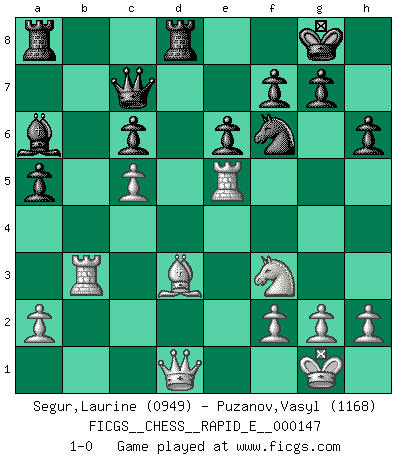Last move : 1-0 2015 May 18 22:36:4 [Event "FICGS__CHESS__RAPID_E__000147"] [Site "FICGS"] [Date "2015.02.09"] [Round "1"] [White "Segur,Laurine"] [Black "Puzanov,Vasyl"] [Result "1-0"] [WhiteElo "0949"] [BlackElo "1168"] 1.d4 d5 2.b3 Nf6 3.c4 c6 4.Nf3 e6 5.e3 Bb4+ 6.Bd2 c5 7.Ne5 O-O 8.Bd3 a5 9.O-O dxc4 10.bxc4 Bxd2 11.Nxd2 cxd4 12.exd4 Qxd4 13.Ndf3 Qb6 14.Rc1 Nc6 15.Re1 h6 16.Nxc6 bxc6 17.c5 Qc7 18.Rb1 Rd8 19.Re5 Ba6 20.Rb3 1-0 This chess game has been lost on time (started : 2015.02.09 12:14:44) Queen's pawn game Kingside Castling by player Black (move 7) Kingside Castling by player White (move 9) Player White won this chess game. Follow this game move after move (download)Bobby just drops the pieces and they fall on the right squares. (Miguel Najdorf) Frage: Gibt es etwas was Sie mehr lieben als Autobahnen ohne Tempobegrenzungen? - Antwort: Deutsche Frauen ohne Tempobegrenzungen. (Loek van Wely) Los problemas de Ajedrez exigen del compositor las mismas virtudes que caracterizan todo el arte de valor: originalidad, invención, concisión, armonía, complejidad e insinceridad explendida. (Vladimir Nabokov) Je ne suis pas le dernier à jouer lâchement des coups douteux pendant le zeïtnot de l'adversaire pour l'achever: en effet les coups qui font le plus peur sont ceux que l'on ne comprend pas. Je me fais souvent peur quand je joue. (Un professeur anonyme) Memory is a way of holding onto the things you love, the things you are, the things you never want to lose. (from the television show: The Wonder Years)