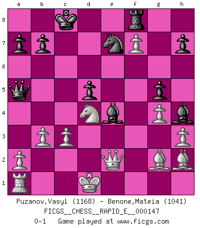 Last move : 0-1 2015 June 4 2:29:30 [Event "FICGS__CHESS__RAPID_E__000147"] [Site "FICGS"] [Date "2015.02.09"] [Round "1"] [White "Puzanov,Vasyl"] [Black "Benone,Mateia"] [Result "0-1"] [WhiteElo "1168"] [BlackElo "1041"] 1.e4 e5 2.f4 d5 3.exd5 c6 4.Qe2 cxd5 5.fxe5 Nc6 6.Nf3 Bg4 7.c3 Qc7 8.d4 O-O-O 9.h3 Bf5 10.Nbd2 f6 11.g4 Bg6 12.Nb3 fxe5 13.Nxe5 Nxe5 14.dxe5 Be7 15.Bf4 Bh4+ 16.Kd1 Be4 17.Bg2 g5 18.Bh2 Ne7 19.Rf1 Rhf8 20.Nd4 Qd7 21.e6 Qa4+ 22.b3 Qa5 23.Rf7 Rxf7 24.exf7 Rf8 0-1 KGD : Nimzovich counter-gambit Queenside Castling by player Black (move 8) Player Black won this chess game. Follow this game move after move (download)The way he plays Chess demonstrates a man's whole nature. (Stanley Ellin) Im Schach gewinnt jeder. Hat man Freunde am Spiel - und das ist die Hauptsache - ist auch der Verlust einer Partie kein Unglück. (David Bronstein) Fischer no está bajo la obligación de nadie. (Joseph Platz) Les échecs sont un jeu terrible. Si vous n'avez pas le centre, votre adversaire a une position plus libre. Par contre, si vous avez le centre, alors vous avez vraiment quelque chose pour laquelle vous inquiéter ! (Siegbert Tarrasch) Every vice is only an exaggeration of a necessary and virtuous function. (Ralph Waldo Emerson, Journals 1936)