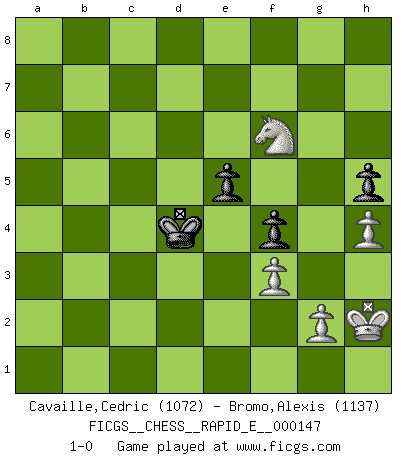 Last move : 1-0 2015 April 12 17:30:15 [Event "FICGS__CHESS__RAPID_E__000147"] [Site "FICGS"] [Date "2015.02.09"] [Round "1"] [White "Cavaille,Cedric"] [Black "Bromo,Alexis"] [Result "1-0"] [WhiteElo "1072"] [BlackElo "1137"] 1.d4 d5 2.Nf3 Nc6 3.e3 a6 4.c4 e6 5.Nc3 h6 6.a3 Nf6 7.b4 Bxb4 8.axb4 Nxb4 9.Ba3 Nc6 10.Be2 Bd7 11.h3 Ne4 12.Nxe4 dxe4 13.Nd2 f5 14.Rb1 b5 15.cxb5 axb5 16.Bb2 Ne7 17.Ra1 Rxa1 18.Qxa1 O-O 19.Ba3 Rf7 20.Bxe7 Qxe7 21.O-O c5 22.dxc5 Qxc5 23.Rc1 Qb4 24.Qc3 Qxc3 25.Rxc3 g5 26.Rb3 f4 27.Bxb5 Bxb5 28.Rxb5 Rd7 29.Nxe4 Kf7 30.exf4 gxf4 31.Rb6 Rd1+ 32.Kh2 Re1 33.f3 Re2 34.Nc5 Kf6 35.Nb3 Rb2 36.Rb8 e5 37.Rb7 Kf5 38.Nc5 Rxb7 39.Nxb7 h5 40.Nd6+ Ke6 41.Nc4 Kd5 42.Nd2 Kd4 43.h4 Kd3 44.Ne4 Kd4 45.Nf6 1-0 Queen's pawn game, Chigorin variation Kingside Castling by player Black (move 18) Kingside Castling by player White (move 21) 10 pieces endgame at move 38 : White KNPPP , Black KRPPP WHITE : King + 1 Knight 3 Pawns BLACK : King + 1 Rook 3 Pawns 9 pieces endgame at move 39 : White KNPPP , Black KPPP WHITE : King + 1 Knight 3 Pawns BLACK : King + 3 Pawns Player White won this chess game. Follow this game move after move (download)It's just you and your opponent at the board and you're trying to prove something. (Bobby Fischer) Ich glaube nicht an Psychologie, ich glaube an gute Züge. (Robert James Fischer) Los asuntos humanos son como una partida de Ajedrez: solo aquellos que no lo toman seriamente, pueden ser llamados buenos jugadores. (Hung Tzu Ch'eng) La solitude du joueur d'Echecs à l'approche du mat est semblable à celle du condamné. (Francis Szpiner) I live to kill Traxler counterattack. (Ilmars Cirulis)