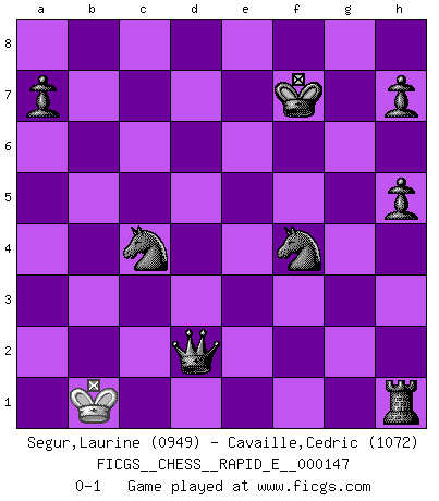 Last move : 0-1 2015 June 2 19:22:39 [Event "FICGS__CHESS__RAPID_E__000147"] [Site "FICGS"] [Date "2015.02.09"] [Round "1"] [White "Segur,Laurine"] [Black "Cavaille,Cedric"] [Result "0-1"] [WhiteElo "0949"] [BlackElo "1072"] 1.d4 d5 2.b3 Nf6 3.Nf3 c5 4.c4 cxd4 5.Nxd4 dxc4 6.bxc4 e6 7.Nd2 Bb4 8.Rb1 Bxd2+ 9.Qxd2 O-O 10.e3 b6 11.Ba3 Re8 12.Be2 Bb7 13.c5 Bxg2 14.Bb5 Bxh1 15.Bxe8 Nxe8 16.f3 e5 17.Nf5 Qxd2+ 18.Kxd2 Bxf3 19.Bb2 Be4 20.Rf1 f6 21.Ke2 Bxf5 22.Rxf5 bxc5 23.Ba3 Nd7 24.Kd3 Rc8 25.Kc4 Kf7 26.Kd5 c4 27.h4 Nb6+ 28.Ke4 c3 29.Kf3 g6 30.Rxe5 fxe5 31.e4 c2 32.Kg4 c1Q 33.Bxc1 Rxc1 34.Kg5 Ng7 35.Kh6 Rh1 36.Kg5 Re1 37.Kg4 Rxe4+ 38.Kf3 Ra4 39.Ke3 Nh5 40.Kd2 Nf4 41.h5 gxh5 42.a3 Rxa3 43.Kc2 Nc4 44.Kb1 Rh3 45.Ka2 e4 46.Kb1 e3 47.Kc1 e2 48.Kb1 e1Q+ 49.Ka2 Qd2+ 50.Kb1 Rh1+ 0-1 Queen's pawn game Kingside Castling by player Black (move 9) Promotion Queen by player Black (move 32) 10 pieces endgame at move 41 : White KP , Black KRNNPPPP WHITE : King + 1 Pawn BLACK : King + 1 Rook 2 Knights 4 Pawns 9 pieces endgame at move 42 : White K , Black KRNNPPPP WHITE : King + BLACK : King + 1 Rook 2 Knights 4 Pawns Promotion Queen by player Black (move 48) Player Black won this chess game. Follow this game move after move (download)Kasparov : J'adoube , Ivanchuk : S'il vous plaît ! (Garry Kasparov & Vassily Ivanchuk, Linares 1997) Die meiste Zeit treffe ich auf Gegner, die meine Enkel sein könnten. Ich bin da, um ihnen zu zeigen, dass sie von mir noch einiges lernen können. (Viktor Kortschnoi) Nos gusta pensar. (Gary Kasparov) D'abord les bases : Jouez et étudiez, puis étudiez et jouez, ensuite jouez et étudiez, puis étudiez et jouez. Deuxièmement : Donnez toujours le meilleur de vous-même ! (Ken Smith) To err is human, to shift the blame on someone else is tactical. (Mladen Jankovic)