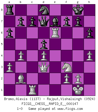 Last move : 1-0 2015 May 3 21:9:31 [Event "FICGS__CHESS__RAPID_E__000147"] [Site "FICGS"] [Date "2015.02.09"] [Round "1"] [White "Bromo,Alexis"] [Black "Rajput,Vishalsingh"] [Result "1-0"] [WhiteElo "1137"] [BlackElo "0924"] 1.d4 d5 2.c4 Bf5 3.Nc3 e6 4.a3 Be7 5.Nf3 Bf6 6.e3 Ne7 7.Bd3 O-O 8.h3 h6 9.O-O Nbc6 10.cxd5 Bxd3 11.Qxd3 Nxd5 12.Nxd5 exd5 13.b4 Re8 14.Bb2 a6 15.Rfe1 Re6 16.e4 Qd7 17.e5 Be7 18.Rac1 Nd8 19.h4 Rg6 20.e6 Rxe6 21.Rxe6 1-0 This chess game has been lost on time (started : 2015.02.09 12:14:44) QGD : Grau (Sahovic) defense Kingside Castling by player Black (move 7) Kingside Castling by player White (move 9) Player White won this chess game. Follow this game move after move (download)Do you realize Fischer almost never has any bad pieces? He exchanges them, and the bad pieces remain with his opponents. (Yuri Balashov) Ich habe die besten Aussichten, den ersten Preis zu gewinnen - denn jeder muss gegen Steinitz spielen, nur ich nicht! (Wilhelm Steinitz) Yo tuve un dolor de muelas en la primer partida. En el segundo juego, tuve un dolor de cabeza. En el tercero, tuve un ataque de reumatísmo. En la cuarta partida, no me sentía muy bien. ¿Y en el quinto juego? Bueno, ¿que acaso uno tiene que ganar todos los juegos?. (Siegbert Tarrasch) Même un GMI sait rarement calculer sur plus de cinq coups une attaque à sacrifices. (Rudolf Spielmann) I find television to be very educating. Every time somebody turns on the set, I go in the other room and read a book. (Groucho Marx)