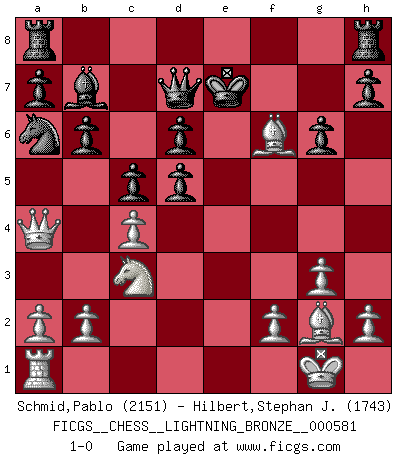 Last move : 1-0 2015 February 9 20:53:48 [Event "FICGS__CHESS__LIGHTNING_BRONZE__000581"] [Site "FICGS"] [Date "2015.02.09"] [Round "1"] [White "Schmid,Pablo"] [Black "Hilbert,Stephan J."] [Result "1-0"] [WhiteElo "2151"] [BlackElo "1743"] 1.d4 Nf6 2.c4 e6 3.Nf3 b6 4.g3 Bb7 5.Bg2 Na6 6.O-O c5 7.e4 Bxe4 8.Nc3 Bb7 9.d5 g6 10.Ne5 exd5 11.Re1 Be7 12.Bh6 d6 13.Qa4+ Nd7 14.Nxd7 Qxd7 15.Rxe7+ Kxe7 16.Bg5+ f6 17.Bxf6+ 1-0 Queen's Indian : 4.g3 Bb7 Kingside Castling by player White (move 6) Player White won this chess game. Follow this game move after move (download)Pawns are born free, yet they are everywhere in chains. (Rick Kennedy) Im Schach gibt es keinen Platz für Galanterie. (Irving Chernev) Aquellos que dicen entender al Ajedrez, no entienden nada. (Robert Hubner) La menace est plus forte que l'exécution. (Aaron Nimzovitch) The question of whether computers can think is just like question of whether submarines can swim. (Edsger W. Dijkstra)
