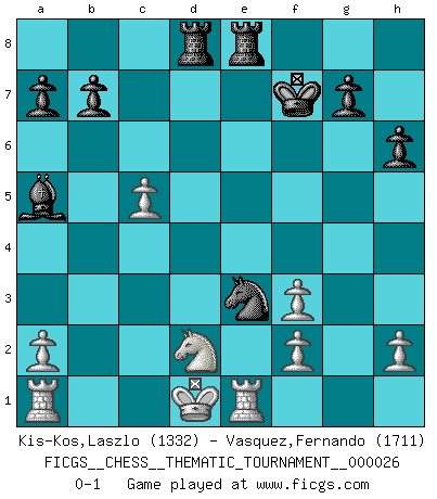 Last move : 0-1 2007 April 22 10:35:14 [Event "FICGS__CHESS__THEMATIC_TOURNAMENT__000026"] [Site "FICGS"] [Date "2007.03.01"] [Round "1"] [White "Kis-Kos,Laszlo"] [Black "Vasquez,Fernando"] [Result "0-1"] [WhiteElo "1332"] [BlackElo "1711"] 1.e4 e5 2.Nf3 Nc6 3.Bc4 Bc5 4.b4 Bxb4 5.c3 Be7 6.d4 exd4 7.Qb3 Na5 8.Bxf7+ Kf8 9.Qa4 Kxf7 10.Qxa5 d5 11.Bf4 c5 12.Qxd8 Bxd8 13.exd5 Nf6 14.cxd4 Re8+ 15.Kd2 Nxd5 16.Be3 Ba5+ 17.Kd1 Bg4 18.Nbd2 Rad8 19.Re1 Bxf3+ 20.gxf3 h6 21.dxc5 Nxe3+ 0-1 Evans gambit : 5...Be7 Player Black won this chess game. Follow this game move after move (download)There must have been a time when men were demigods, or they could not have invented Chess. (Gustav Schenk) Wer der Ansicht ist, daß alle Schachspieler verrückt sind, wird durch Studium des Lebens von Emil Josef Diemer nicht auf andere Gedanken kommen. (Hans Ree) El Ajedrez es un invernadero donde los frutos del carácter pueden madurar mas completamente que en la vida. (Edward Morgan Foster) Aux échecs, l'amour-propre est satisfait quand on remporte la victoire, mais il n'y a pas de honte à être battu. (Benjamin Franklin) Yoga is 99% practice and 1% knowledge. (Sri Krishna Pattabhi Jois)